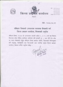 आज विहिबार चितवन प्रशासनले एक सूचना जारी गर्दै संविधान दिवस २०७८ का अवसरमा आगामी असोज २ , ३ र ४ गते राष्ट्रिय दिवसका रुपमा तीनै दिन साँझ घर घरमा दीपावलीसहितका कार्यक्रम गरेर संविधान दिवस मनाउन जिल्लाबासीलाई अनुरोध गरेको हो ।