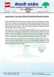 कांग्रेस चितवनले राजनीतिक दल र सम्बन्धित व्यक्ति तथा समूहहरूलाई कानुनी मर्यादा र न्यायिक प्रक्रिया प्रतिको सम्मान गर्न पनि विज्ञप्ति मार्फत अपिल गरेको छ।