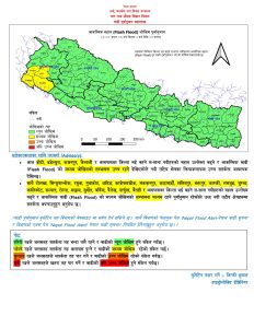 बाढी पूर्वानुमान महाशाखाका अनुसार आज डोटी, डडेल्धुरा, कञ्चनपुर, कैलाली र आसपासका जिल्ला भई बहने स-साना नदीहरूको बहाव उल्लेख्य बढ्ने र आकस्मिक बाढीको मध्यम जोखिमको सम्भावना उच्च रहने पूर्वानुमान छ । साथै दोलखा, सिन्धुपाल्चोक, रसुवा, नुवाकोट, धादिङ, काभ्रेपलाञ्चोक, मकवानपुर, काठमाडौँ, ललितपुर, भक्तपुर, कास्की, लमजुङ, जुम्ला, कालिकोट, सल्यान, रोल्पा, अछाम, सुर्खेत, बर्दिया, दैलेख, दार्चुला, बैतडी र आसपासका जिल्ला भई बहने स-साना नदीहरूको बहाव उल्लेख्य बढ्ने र आकस्मिक बाढीको मध्यम जोखिमको सम्भावना मध्यम रहने पूर्वानुमान छ।