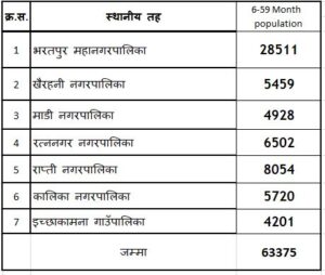 चितवन जिल्लामा ६ देखि ५९ महिनासम्मका बालबालिकाको जनसंख्या ६३ हजार ३७५ रहेको छ । यी सबै बालबालिकालाई भिटामिन ए र एक वर्षदेखि ५ वर्षसम्मका बालबालिकालाई जुकाको औषधि खुवाइने स्वास्थ्य कार्यालय चितवनले जनाएको छ । यो उमेर समूहमा ५६ हजार भन्दा बढी जनसंख्या रहेको छ ।