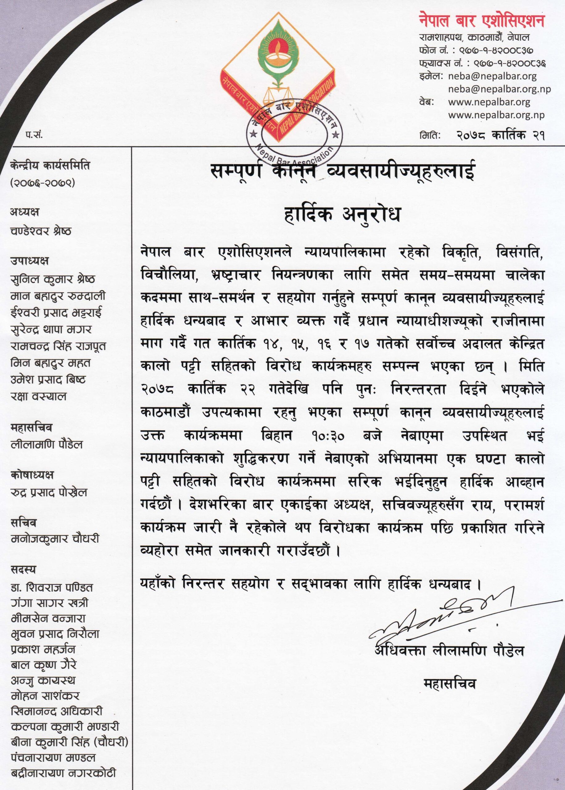 ‘प्रधानन्यायाधीशज्यूको राजीनामा माग गर्दै गत कात्तिक १४, १५, १६ र १७ गतेको सर्वोच्च अदालत केन्द्रित कालो पट्टी सहितको विरोध कार्यक्रमहरु सम्पन्न भएका छन् । मिति २०७८ कात्तिक २२ गतेदेखि पनि पुनः निरन्तरता दिईने भएकोले काठमाडौं उपत्यकामा रहनु भएका सम्पूर्ण कानुन व्यवसायीज्यूहरुलाई उक्त कार्यक्रममा बिहान १०ः३० बजे नेबाएमा उपस्थित भई न्यायपालिकाको शुद्धीकरण गर्ने नेबाएको अभियानमा एक घण्टा कालो पट्टी सहितको विरोध कार्यक्रममा सरिक भईदिनुहुन हार्दिक आह्वाान गर्दछौँ’, आइतबार महासचिव लीलामणि पौडेलले जारी गरेको विज्ञप्तिमा भनिएको छ ।