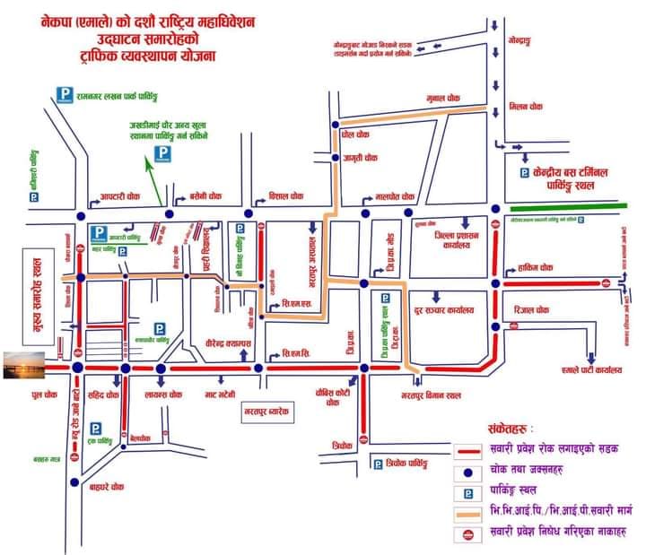चितवन। नेकपा एमालेको १०औँ महाधिवेशनको उद्घाटन सत्रलाई लक्षित गरी चितवनका केही स्थानमा सवारीसाधन प्रवेशमा रोक लगाइएको छ । शुक्रबार नारायणी नदी किनारमा उद्घाटन समारोह हुँदै छ भने त्यसपछि बन्द सत्रका कार्यक्रममा सौराहामा हुनेछ।