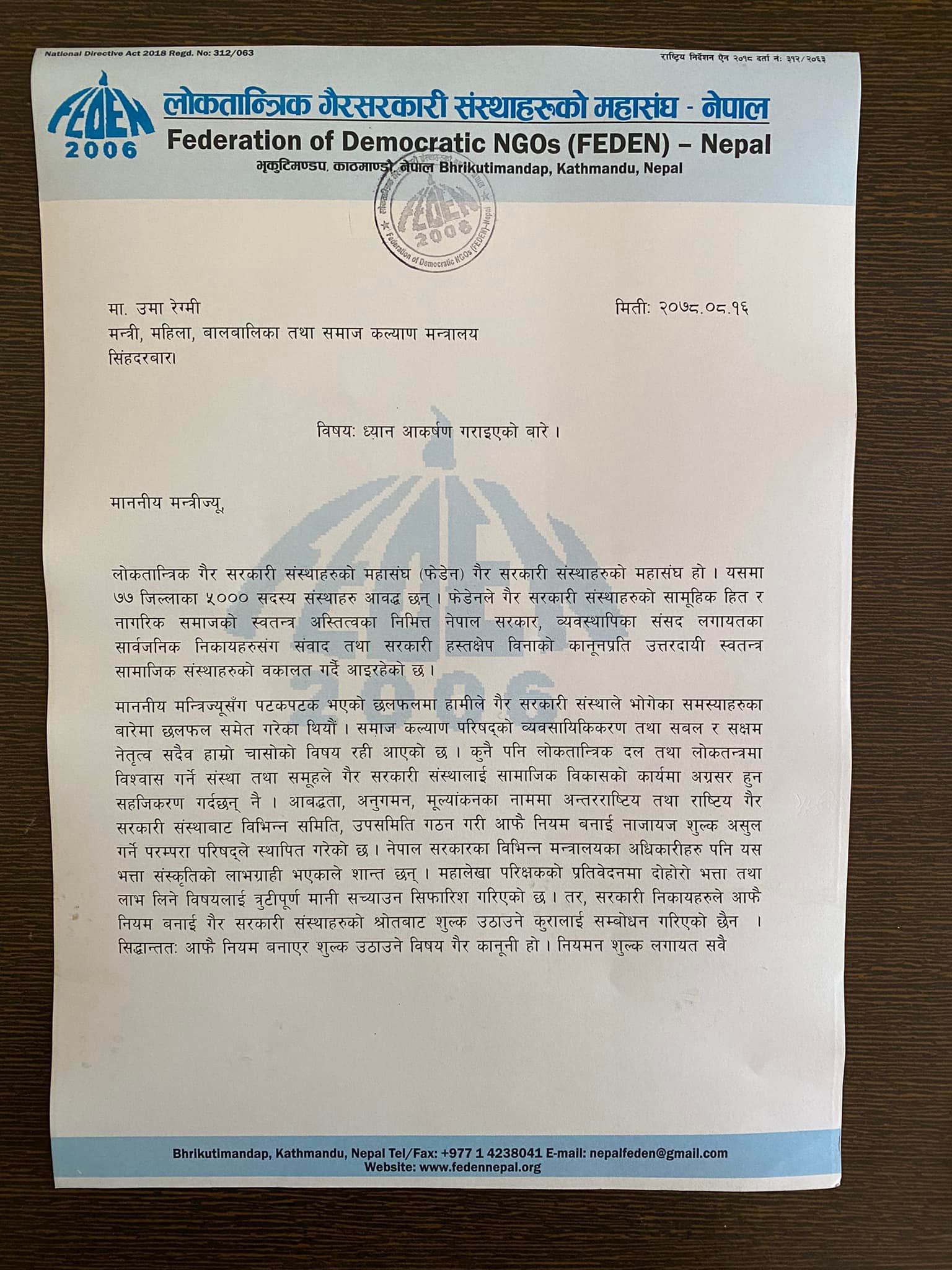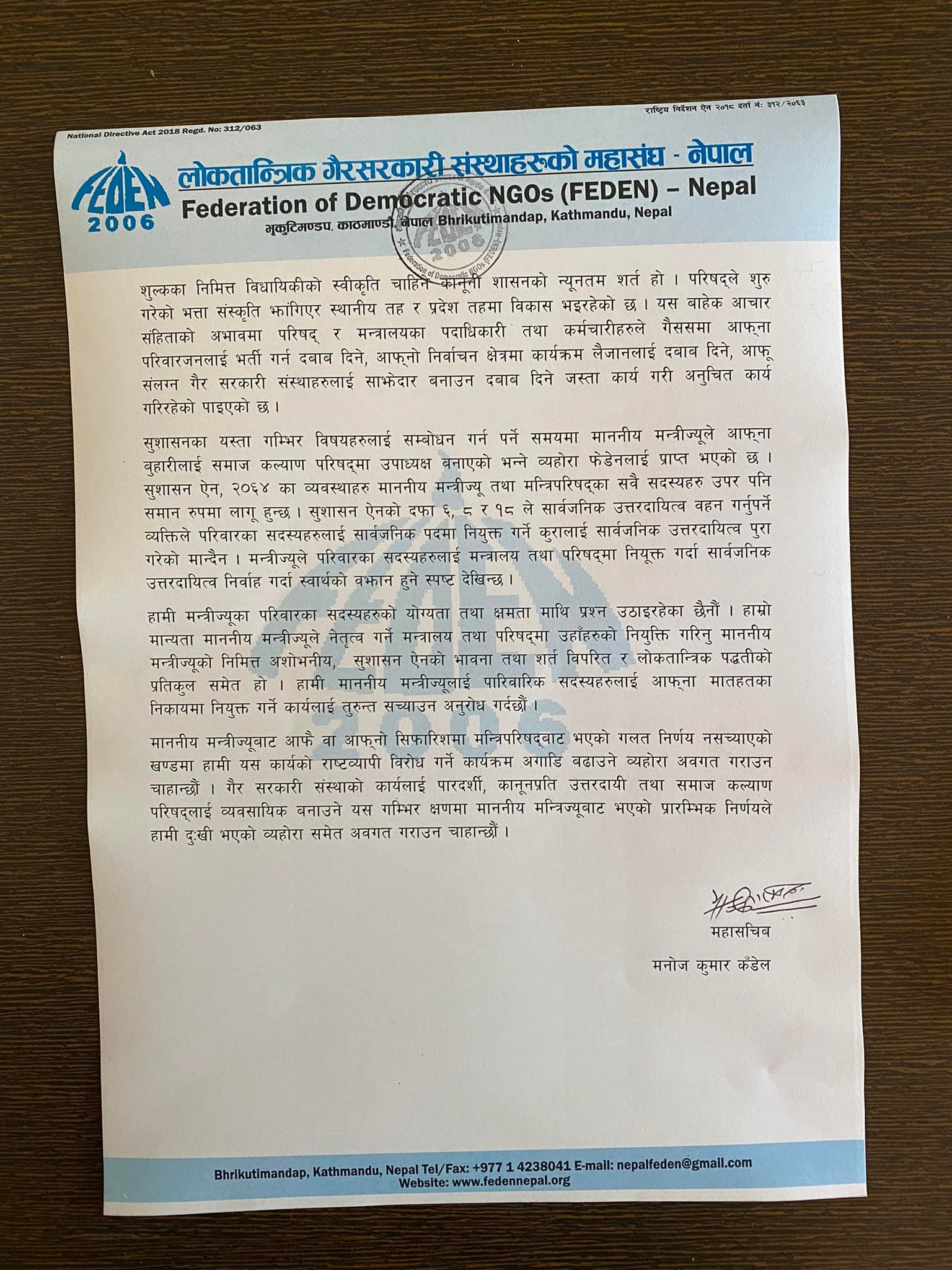 नेपाली कांग्रेस निकट गैरसरकारी संस्थाहरुको संगठन लोकतान्त्रिक गैरसरकारी संस्था महासंघ–नेपालले ध्यानाकर्षणपत्रमा भनेको छ, ‘हामी मन्त्रीज्यूको परिवारको सदस्यको योग्यता र क्षमतामाथि प्रश्न उठाइरहेका छैनौँ, हाम्रो मान्यता माननीय मन्त्रीज्यूले नेतृत्व गर्ने मन्त्रालय तथा परिषदमा उहाँको नियुक्ति गर्नु अशोभनीय सुशासन ऐनको भावनाविपरीत लोकतान्त्रिक पद्धतिको प्रतिकुल हुन्छ ।’