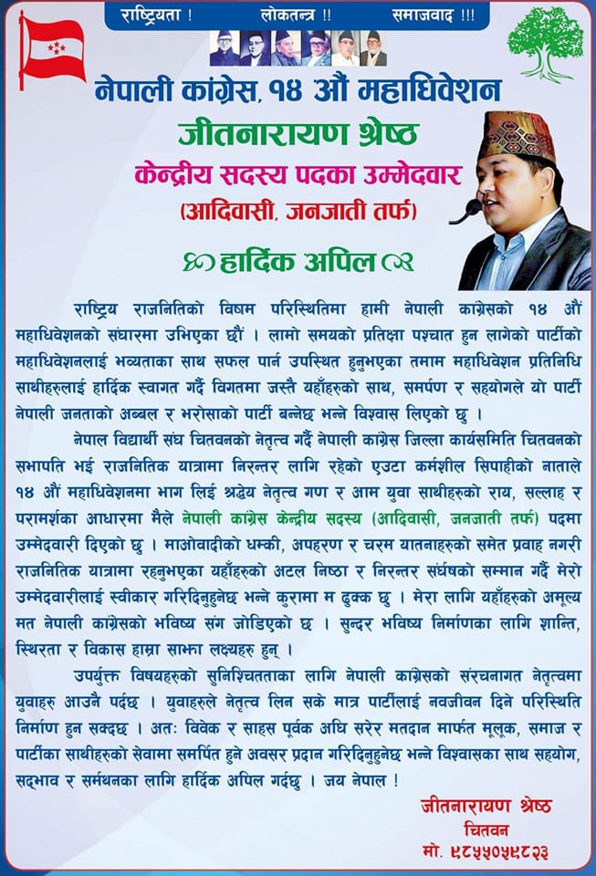 उनले अपिलमा भनेका छन्, ‘युवाहरुले नेतृत्व लिन सके मात्र पार्टीलाई नवजीवन दिने परिस्थिति निर्माण हुन सक्छ, मेरा लागि यहाँहरुको अमूल्य मत कांग्रेसको भविष्यसँग जोडिएको छ । श्रेष्ठ हाल नेपाली काँग्रेस चितवनको सभापति हुन् । उनको विजयी भए चितवनको पहिलो केन्द्रीय सदस्य हुनेछन् । ७५ वर्षको इतिहासमा चितवनका कुनै नेता नेपाली कांग्रेसको केन्द्रीय सदस्य हुन सकेका छैनन् ।