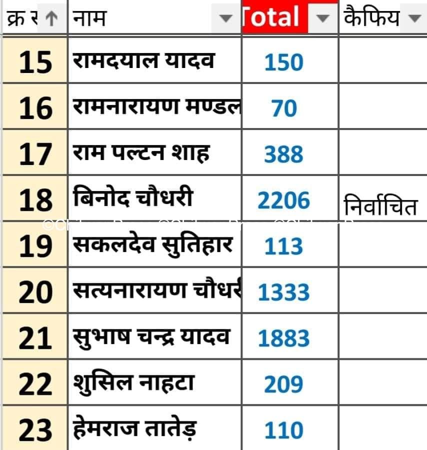 तेस्रोमा चन्द्रमोहन यादवले २१३८, महेन्द्र कुमार यादवले १९८४ र पाँचौंमा दिनेश कुमार यादवले १९५९ मत प्राप्त गरेका छन् ।