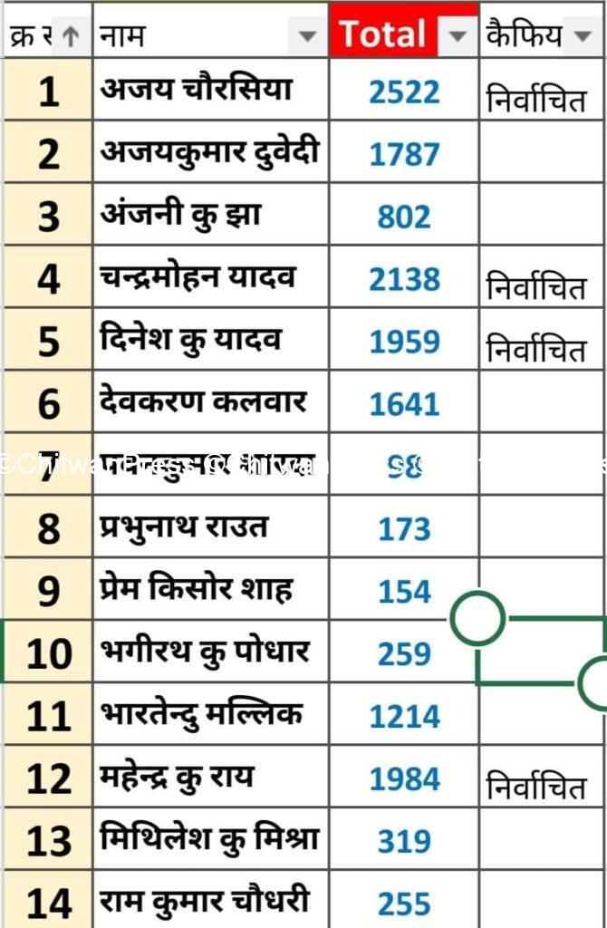 मंगलबार दिउँसो सम्पन्न मतगणनामा २५२२ मतसहित पार्टीको तराई मधेश समन्वय विभाग प्रमुख तथा पूर्वमन्त्री अजय चौरसिया अग्रस्थानमा विजयी भएका छन् । ४६६७ मत खसेकोमा अजयले अर्बपति उद्योगपति विनोद चौधरीलाई पनि उछिनेर सर्वाधिक मत प्राप्त गरेका छन् । दोस्रो स्थानमा रहेका समानुपातिक सांसद चौधरीले २२०६ मत प्राप्त गरेका छन् ।