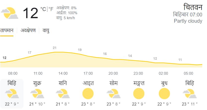 दिउँसो जिल्लाभर आंशिकदेखि सामान्य बदली रहनेछ । पहाडी भूभागको थोरै स्थानमा हल्का वर्षा र उच्च पहाडी तथा हिमाली भूभागका केही स्थानमा हल्कादेखि मध्यम हिमपातको सम्भावना रहेकोले चितवनमा पनि त्यस्को प्रभाव पर्ने जल तथा मौसम विज्ञान विभाग महाशाखाले जनाएको छ।
