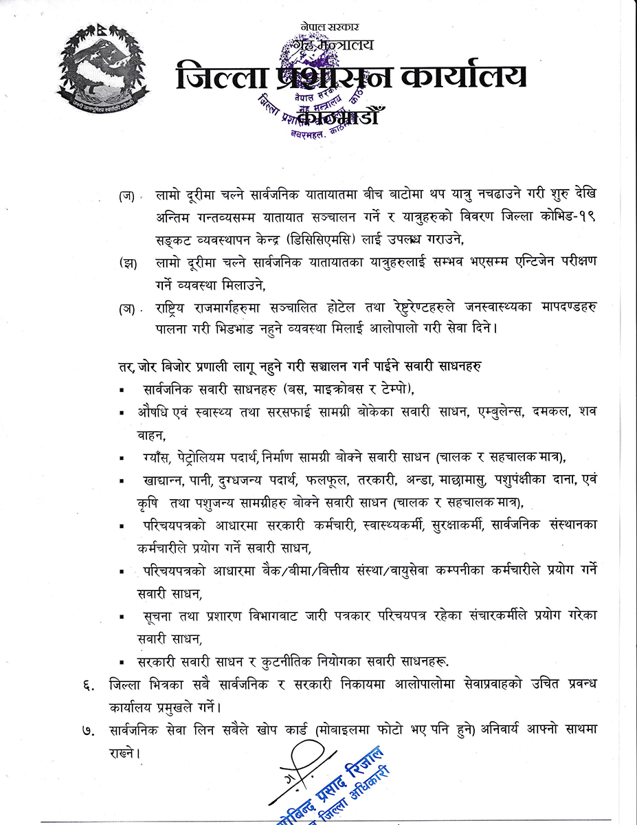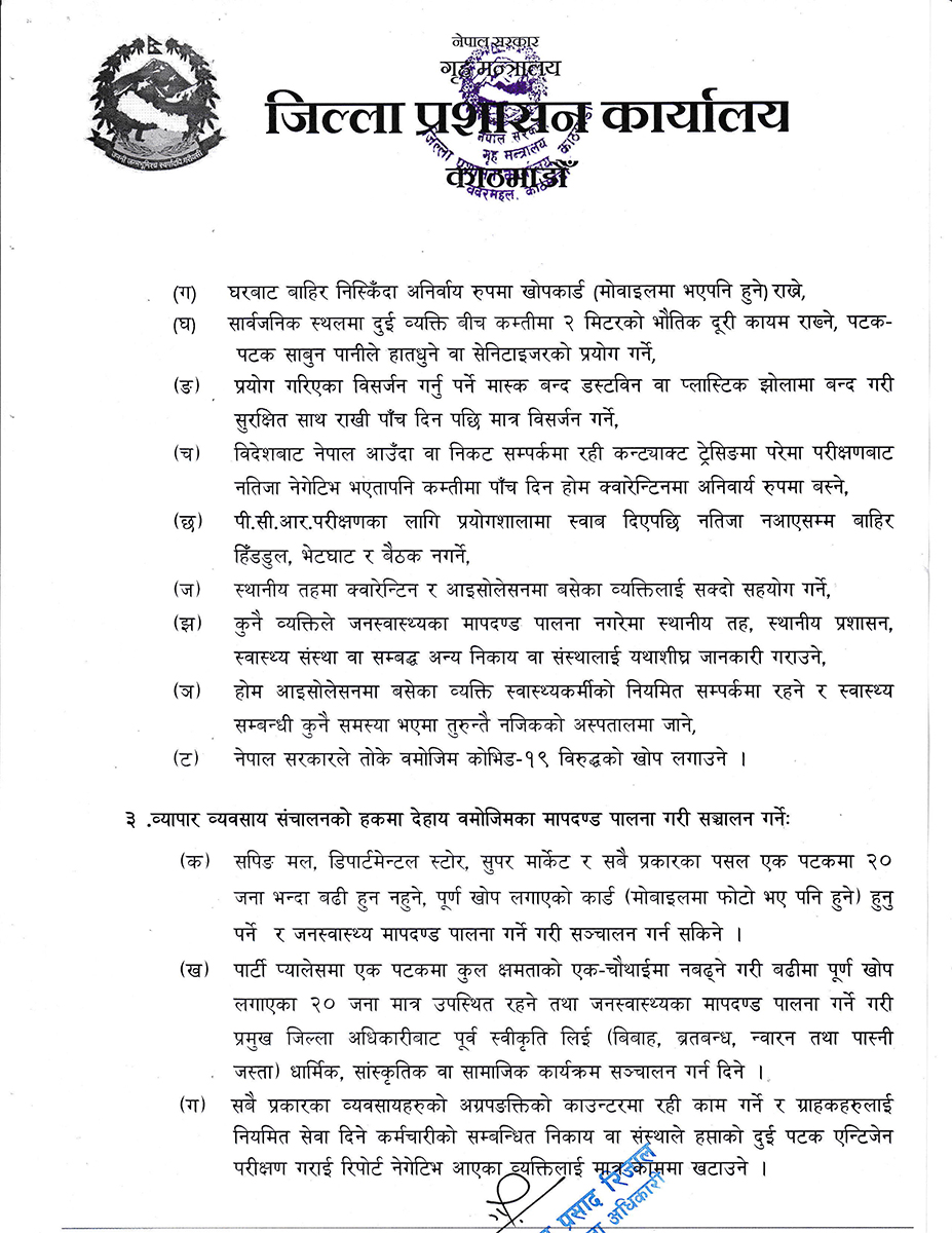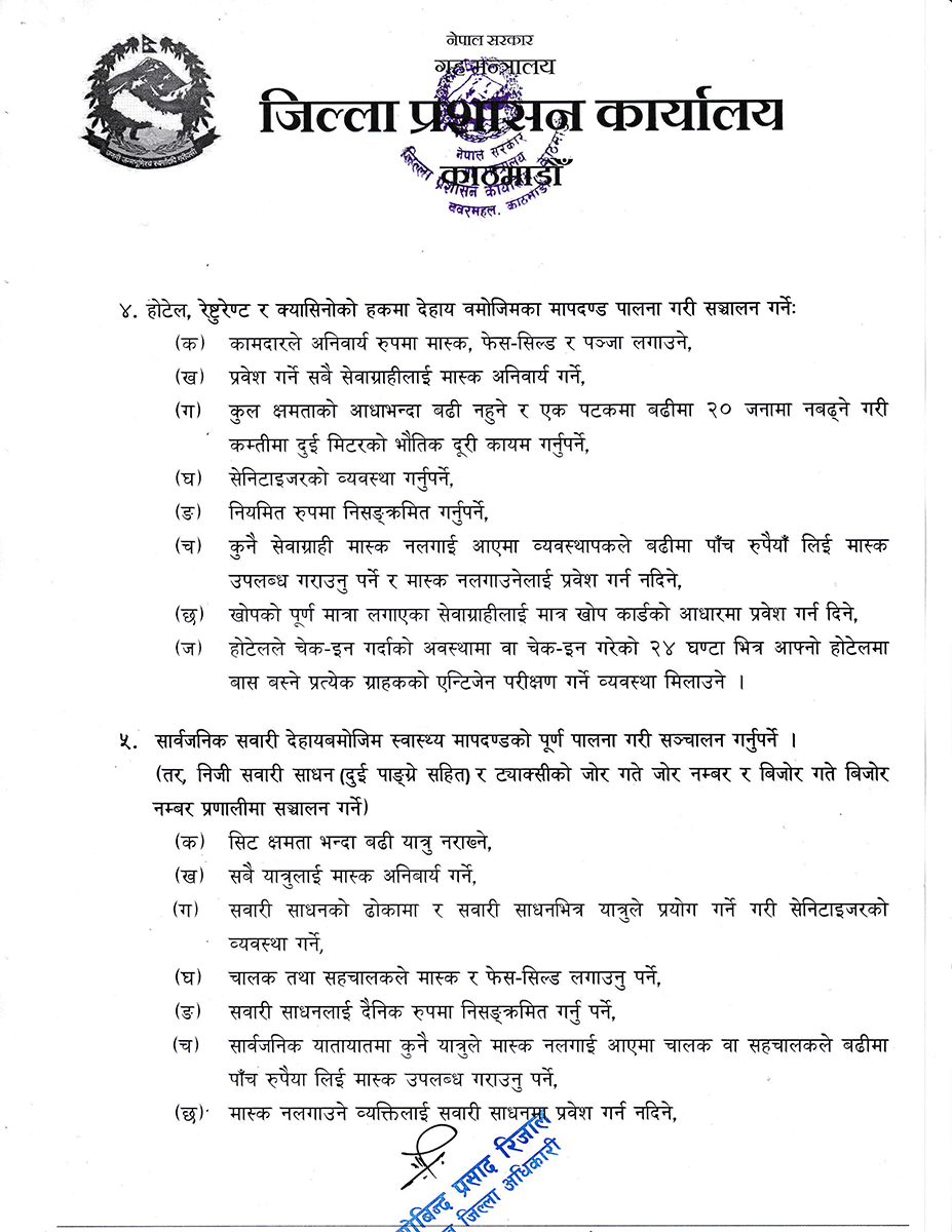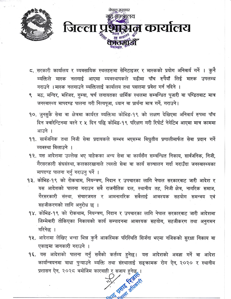 जिल्ला प्रशासन कार्यालय काठमाडौंका प्रमुख जिल्ला अधिकारी (सीडीओ) गोविन्दप्रसाद रिजालले शुक्रबार राति १२ बजेदेखि लागू हुने गरी नयाँ आदेश जारी गरेका छन् ।