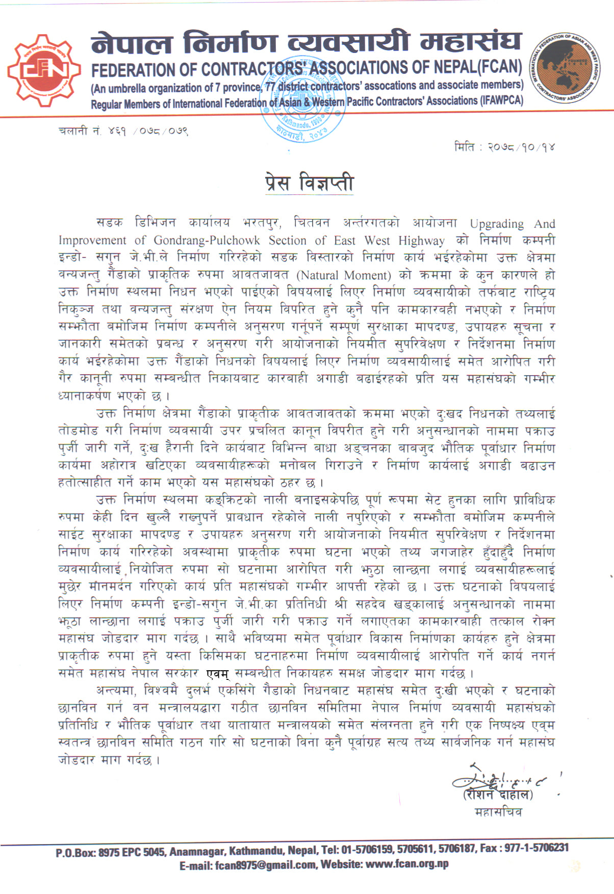 निर्माण व्यवसायीलाई नियोजित रुपमा सो घटनामा आरोपित गरी झुठा लान्छना लगाई व्यवसायीहरूलाई मुछेर मानमर्दन गरिएको कार्य प्रति महासंघको गम्भीर आपत्ती रहेको जनाइएको छ । ‘वन मन्त्रालयले गठन गरेको छानबिन समितिमा नेपाल निर्माण व्यवसायी महासंघका प्रतिनिधि र भौतिक पूर्वाधार तथा यातायात मन्त्रालयको समेत संलग्नता हुने गरी एक निष्पक्ष एवं स्वतन्त्र छानबिन समिति गठन गरी यस घटनाको बिना कुनै पूर्वाग्रह सत्य-तथ्य सार्वजनिक गर्न महासंघले जोडदार माग गर्दछ’, विज्ञप्तिमा भनिएको छ ।