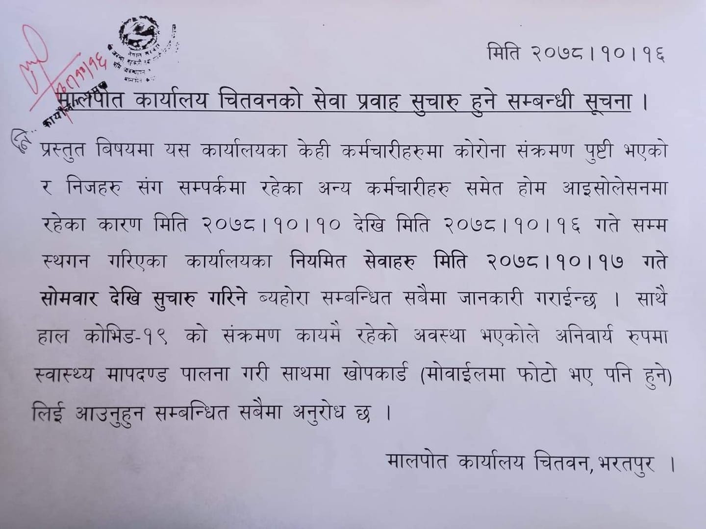 मालपोत कार्यालयका कर्मचारीमा कोरोना देखिएपछि सूचना जारि गर्दै माघ १० गते देखि १६ गते सम्मका लागि आन्तरिक बाहेकका सबै सेवा बन्द गरिएको थियो।