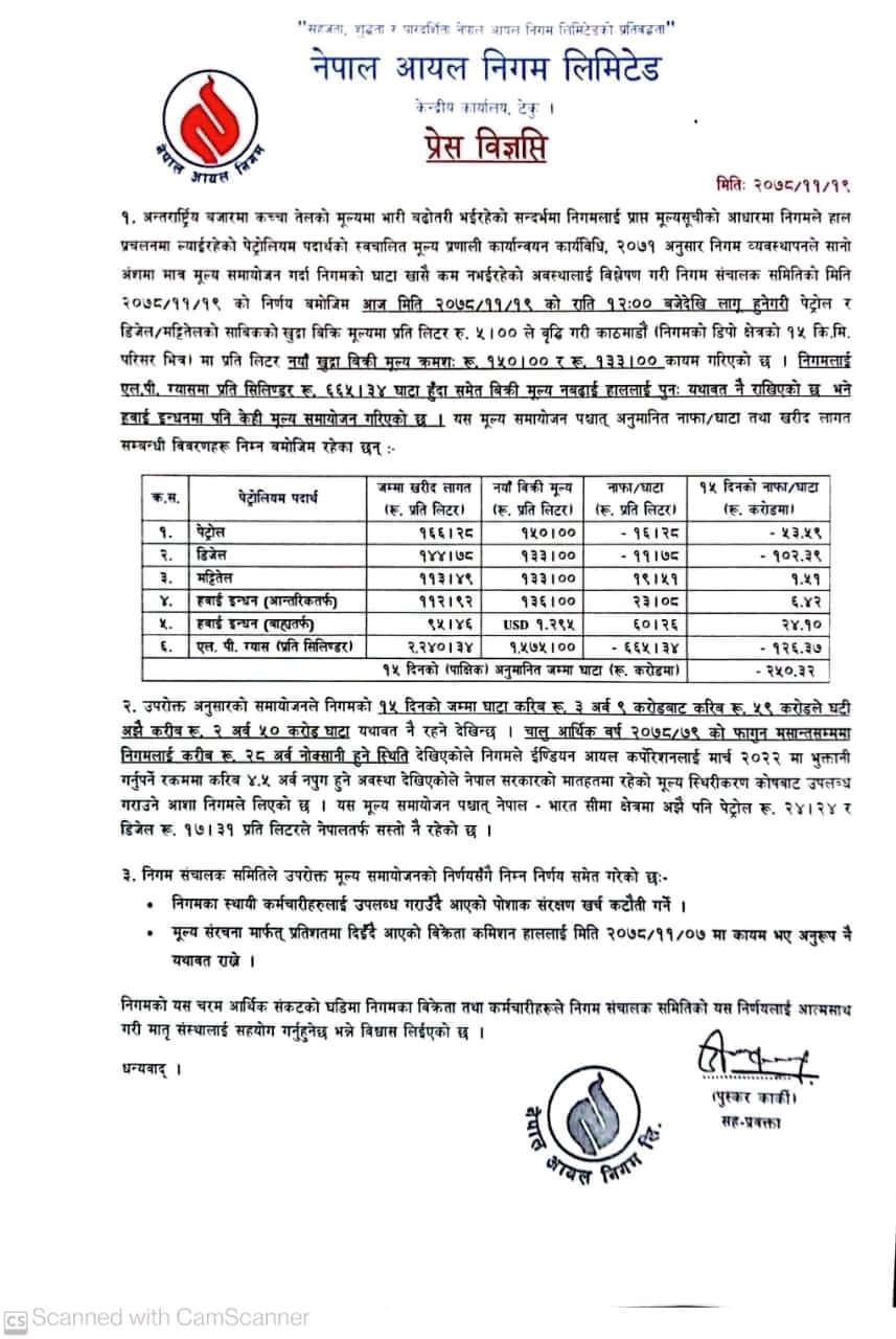निगमका अनुसार अब पेट्रोलको मूल्य प्रतिलिटर १५० रूपैयाँ पुगेको छ भने डिजेल र मट्टीतेलको मूल्य प्रतिलिटर पाँच १३३ रुपैयाँ पुगेको छ । एलपी ग्यास र हवाई इन्धनको मूल्य यथावत राखेको निगमले जनाएको छ ।
