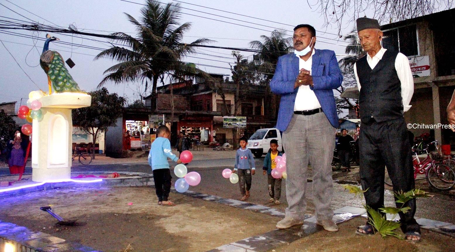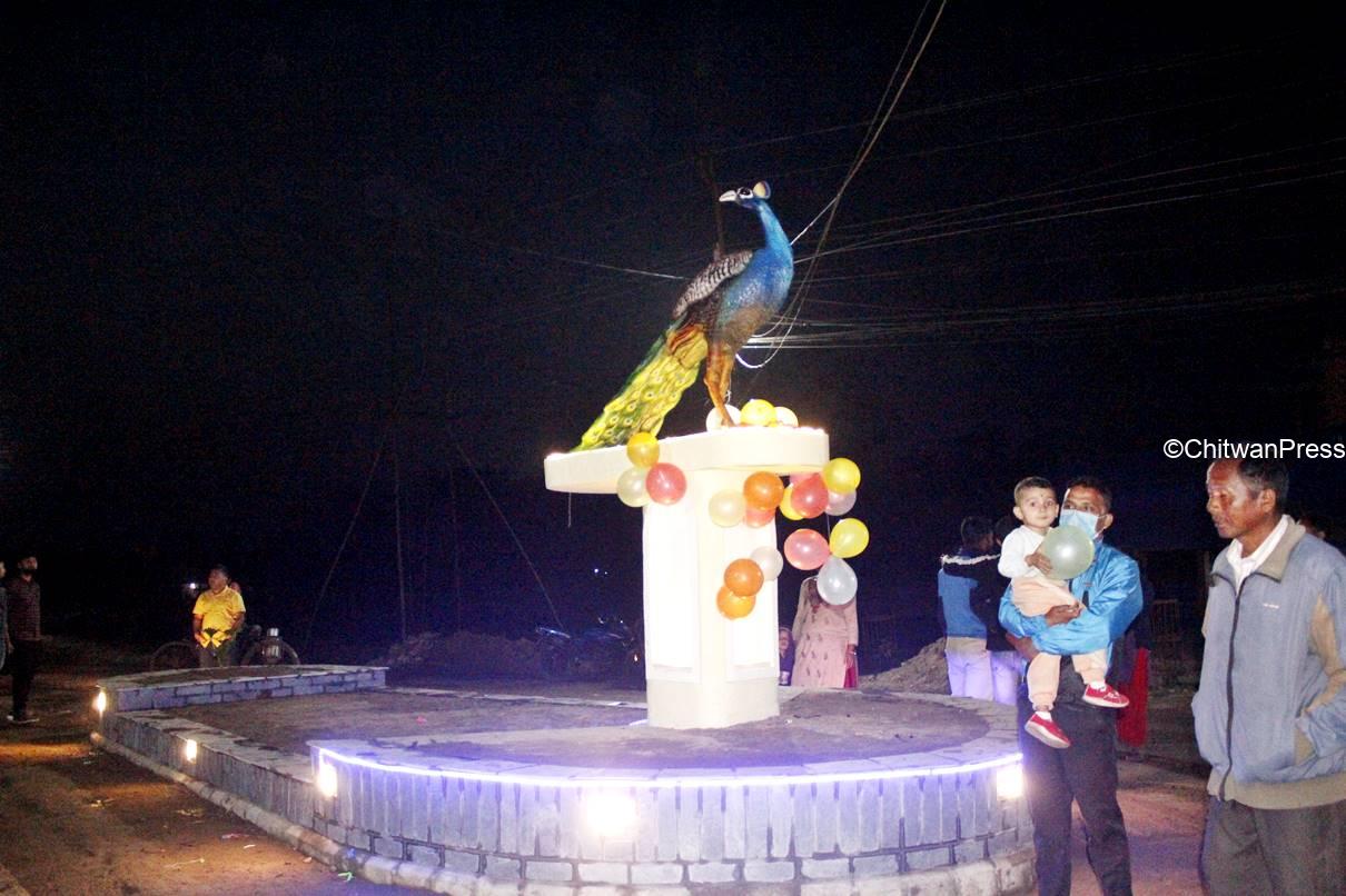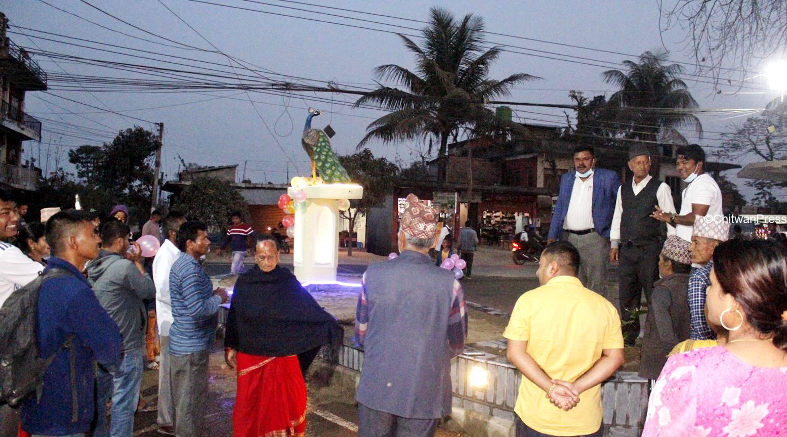 चितवन । रत्ननगर नगरपालिका वडा नं -७ स्थित मालपुरमा चरा चोकको उद्घाटन गरिएको छ । आज (आइतबार) चरा (मयूर)को मुर्ति स्थापना गर्दै चरा चोकको उद्घाटन गरिएको हो ।