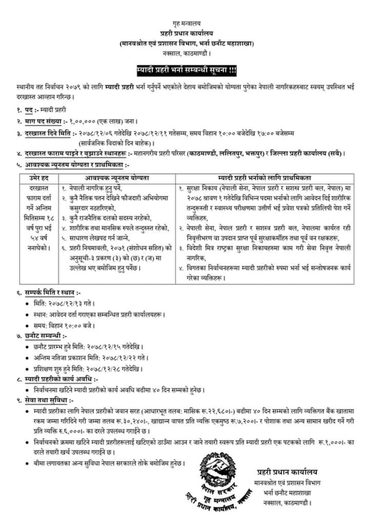 काठमाडौं। स्थानीय तहको निर्वाचनका लागि म्यादी प्रहरीको भर्ना खुलेको छ। मंगलबार नेपाल प्रहरीले एक लाख म्यादी प्रहरीको भर्ना खुलाएको हो। प्रहरी प्रधान कार्यालय, मानवस्रोत एवम् प्रशासन विभागले सार्वजनिक गरेको सूचना चैत ६ गतेदेखि ११ गतेसम्म आवेदन दिन पाइने छ।