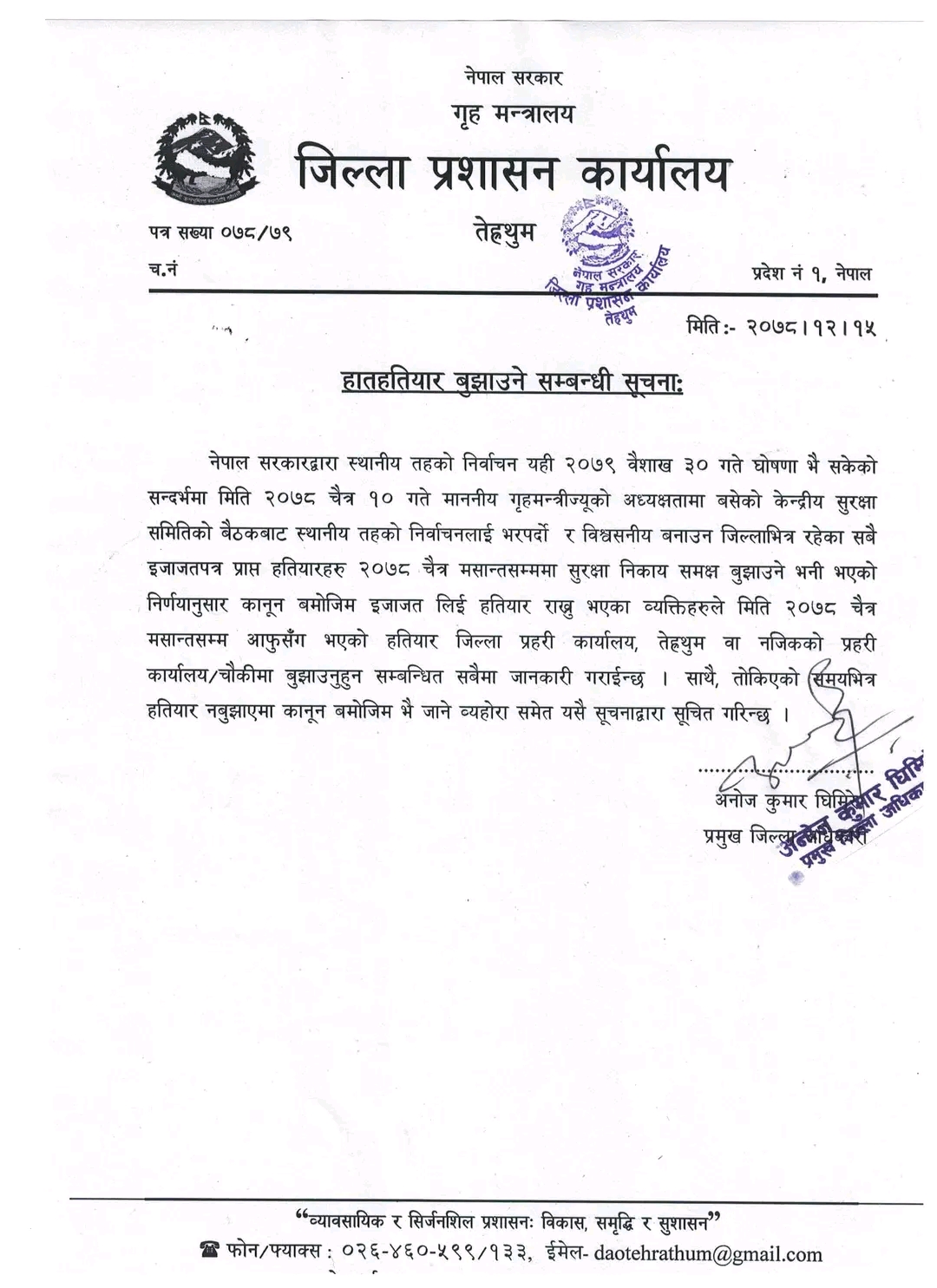 प्रमुख जिल्ला अधिकारी अनोजकुमार घिमिरेले गृह मन्त्रालयको निर्देशन बमोजिम हातहतियार बुझाउन सूचना जारी गरिएको बताए । स्थानीय तहको निर्वाचनलाई भरपर्दो र विश्वासिलो बनाउन तथा शान्ति सुरक्षा कायम राख्नका लागि जिल्लाभित्र रहेको इजाजत प्राप्त हातहतियार चैतभित्र जिल्ला प्रहरी कार्यालय तथा नजिकैको प्रहरी चौकीमा बुझाउन स्थानीय प्रशासनले सबैमा अनुरोध गरिएकाे छ ।