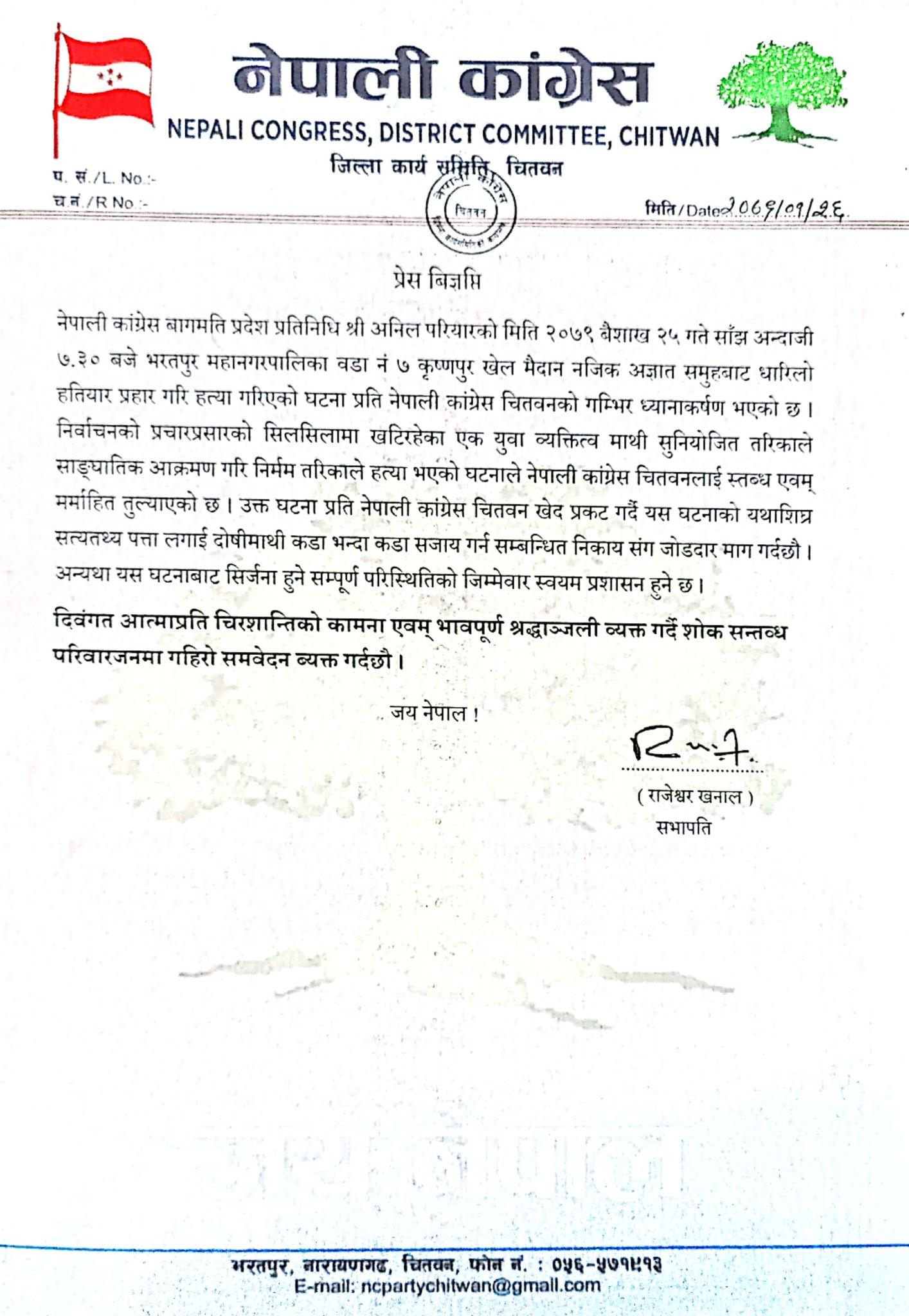 नेपाली काङ्ग्रेस चितवनका सभापति राजेश्वर खनालले एक विज्ञप्ति जारी गर्दै निर्वाचनको प्रचारप्रसारको सिलसिलामा खटिरहेका एक युवा व्यक्तित्व माथी सुनियोजित तरिकाले साङ्घातिक आक्रमण गरि निर्मम तरिकाले हत्या भएको घटनाले नेपाली कांग्रेस चितवनलाई स्तब्ध एवम् मर्माहित तुल्याएको बताएका छन्।