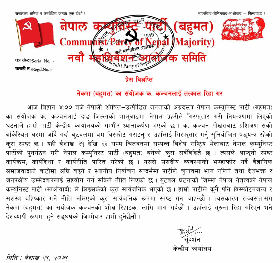 संयोजक धर्मेन्द्र बास्तोलालाई दाङ प्रहरीले पक्राउ गरेपछि पार्टीका केन्द्रीय कार्यालय सदस्य हेमन्तप्रकाश वलीले विज्ञप्ति जारी गर्दै प्रष्टिकरण दिएका हुन् ।