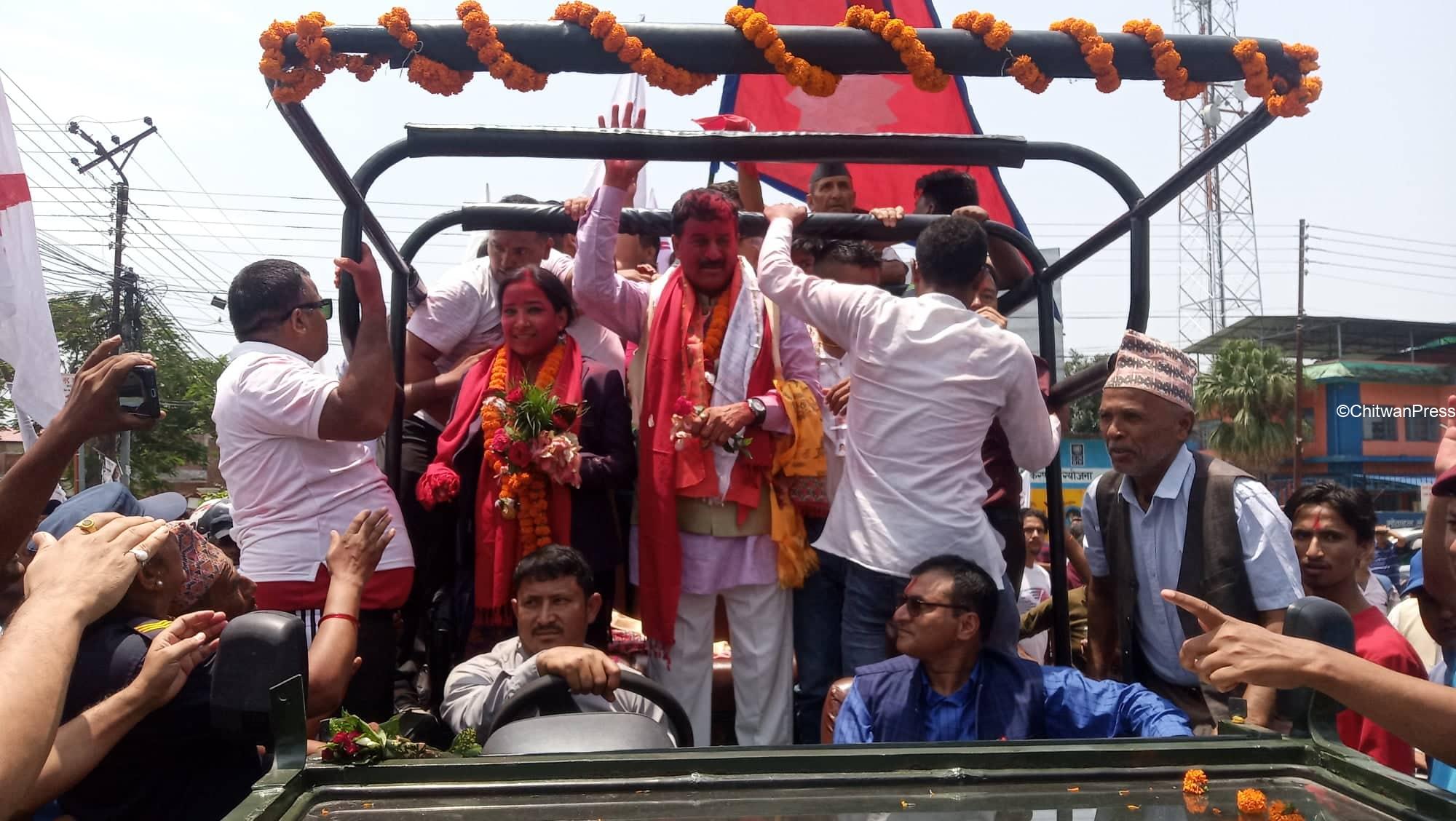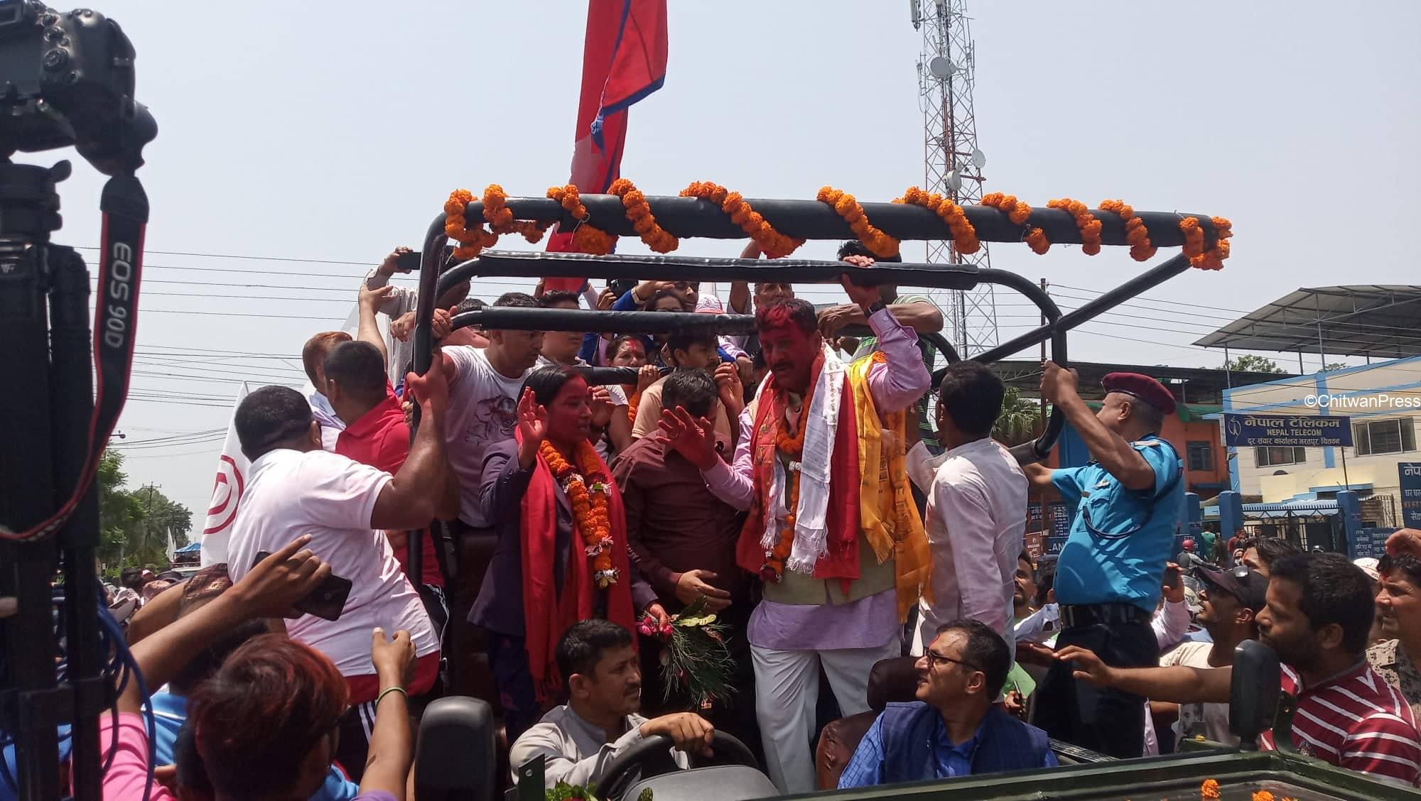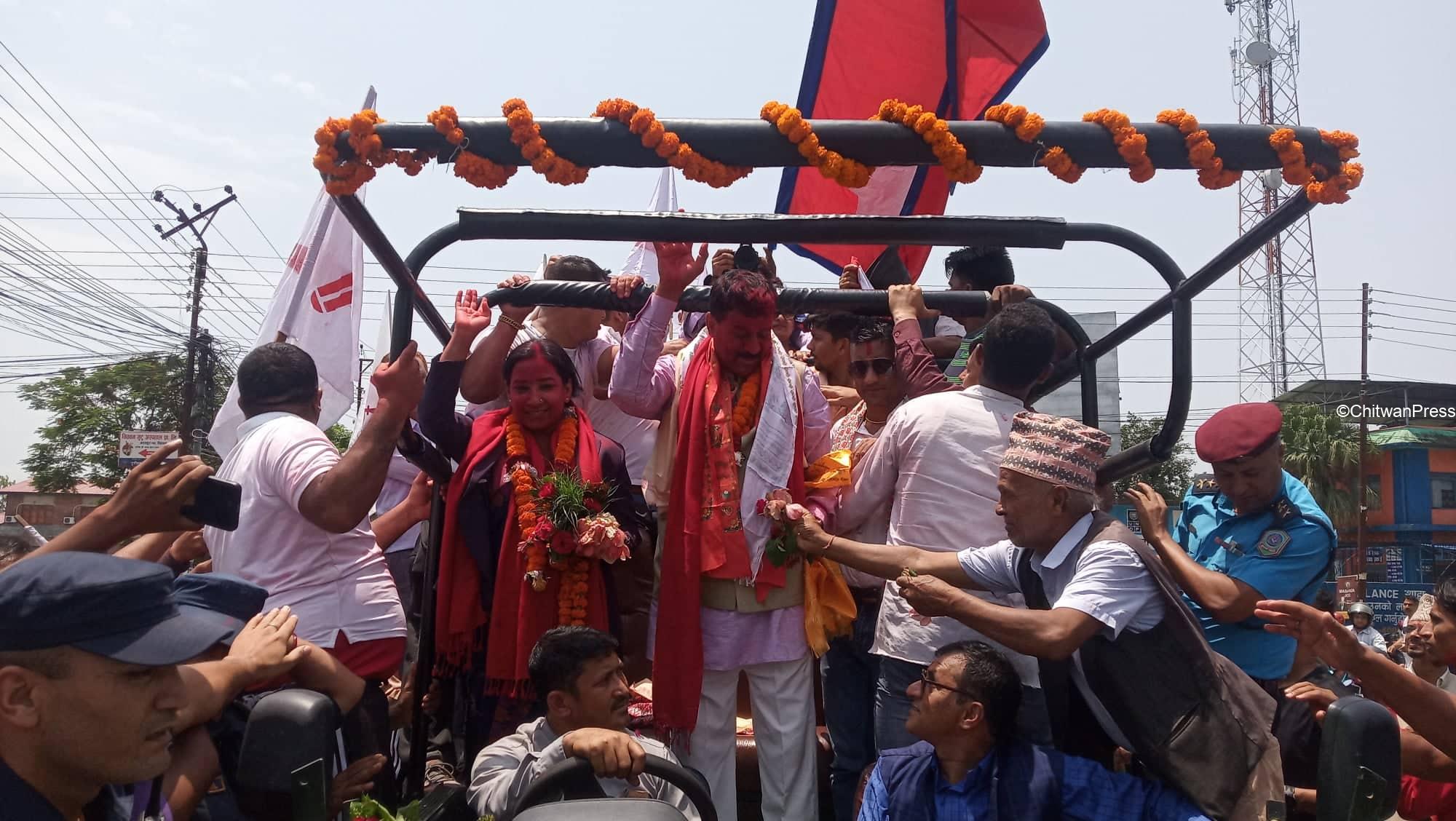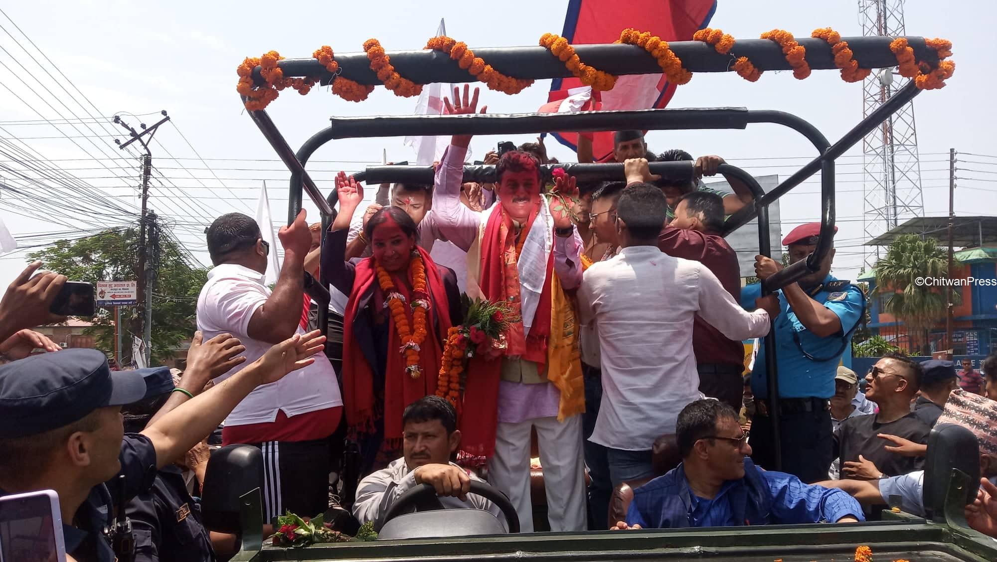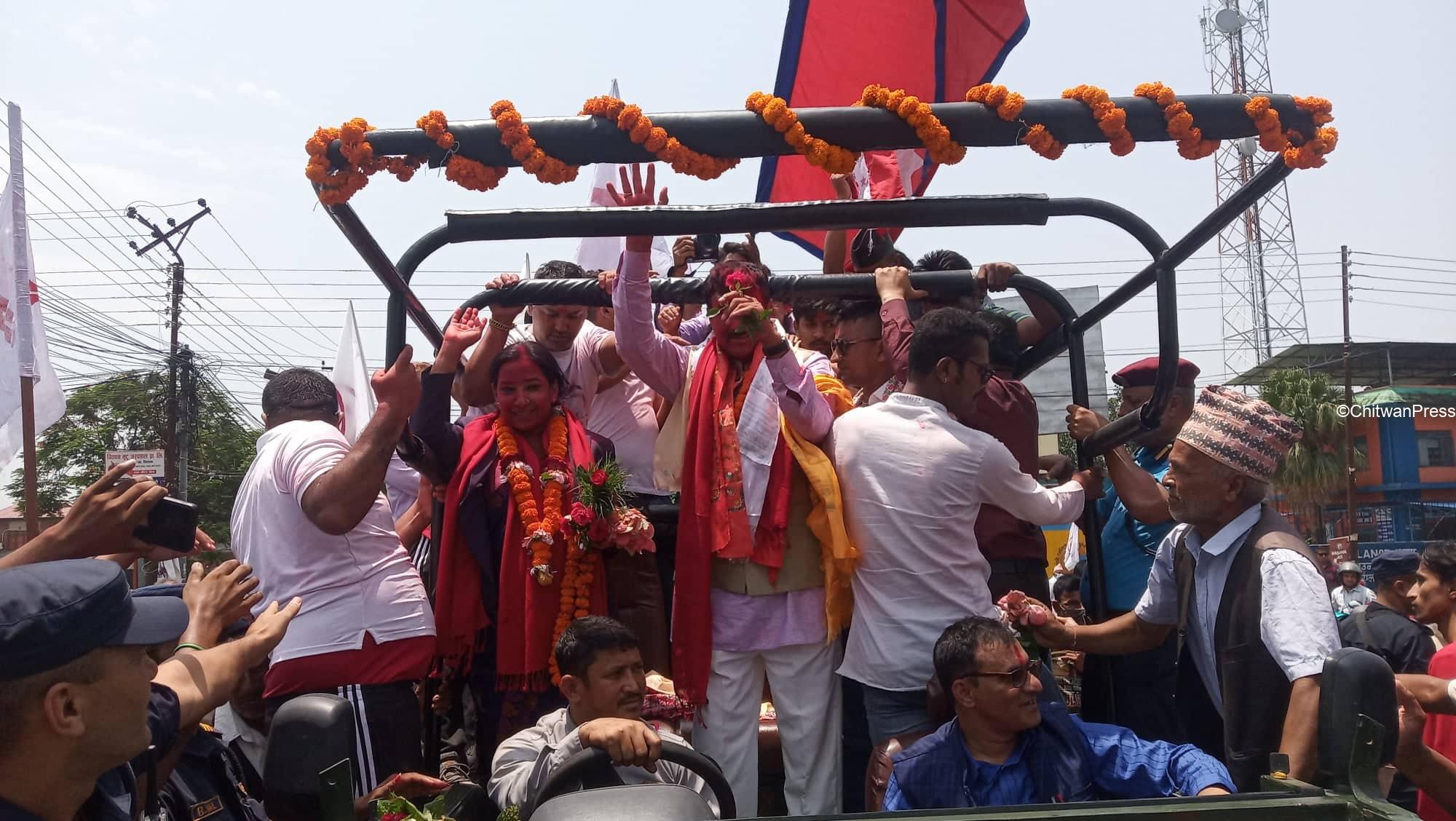 चितवन । चितवनको भरतपुर महानगरपालिकाको मेयर र उपमेयरमा सत्ता गठबन्धनका उम्मेदवार विजयी भएसँगै उत्सव मनाउन सुरु भएको छ । गठबन्धनबाट माओवादी केन्द्रकी उम्मेदवार रेनु दाहाल र उपमेयरमा काँग्रेसका चित्रसेन अधिकारी निर्वाचित भएका हुन् ।