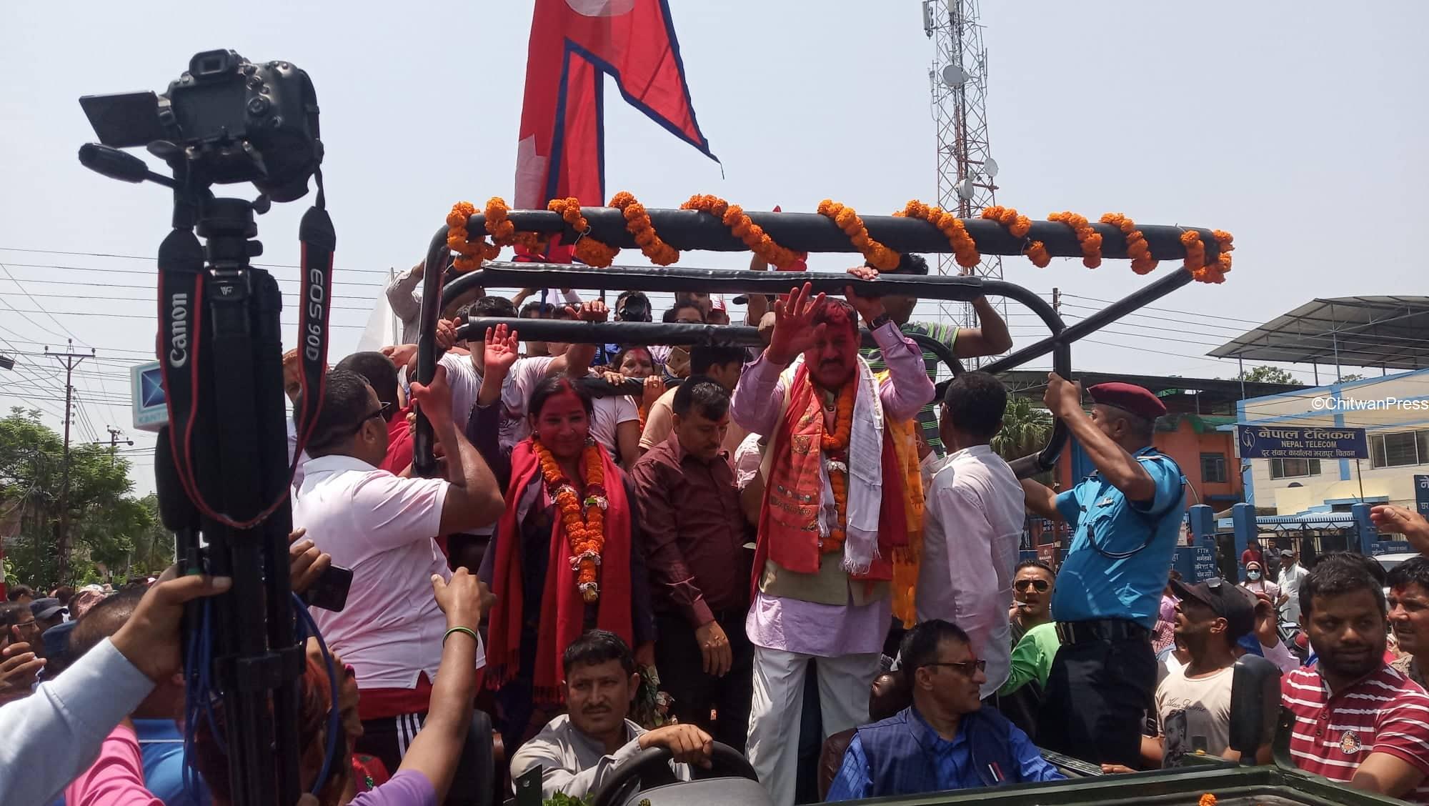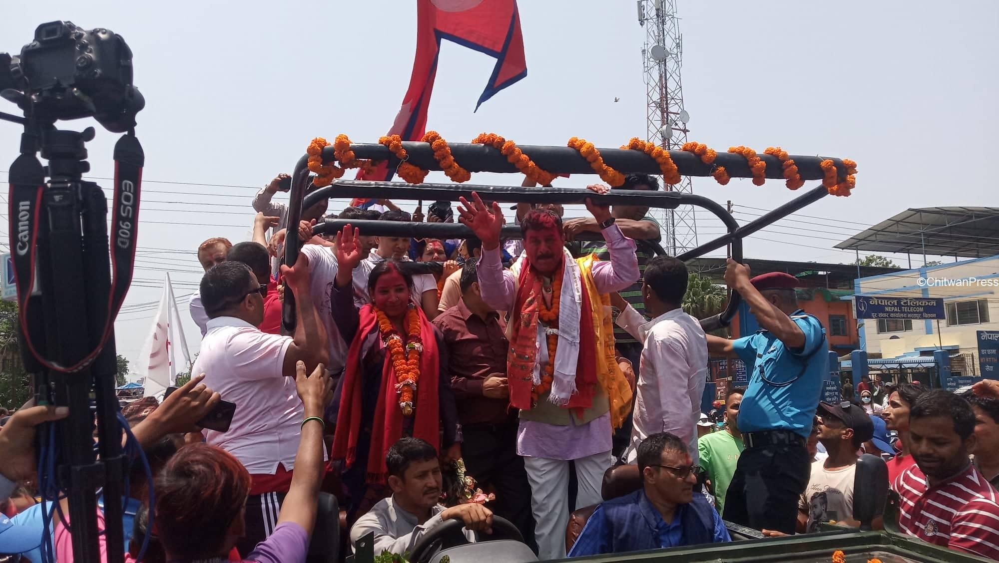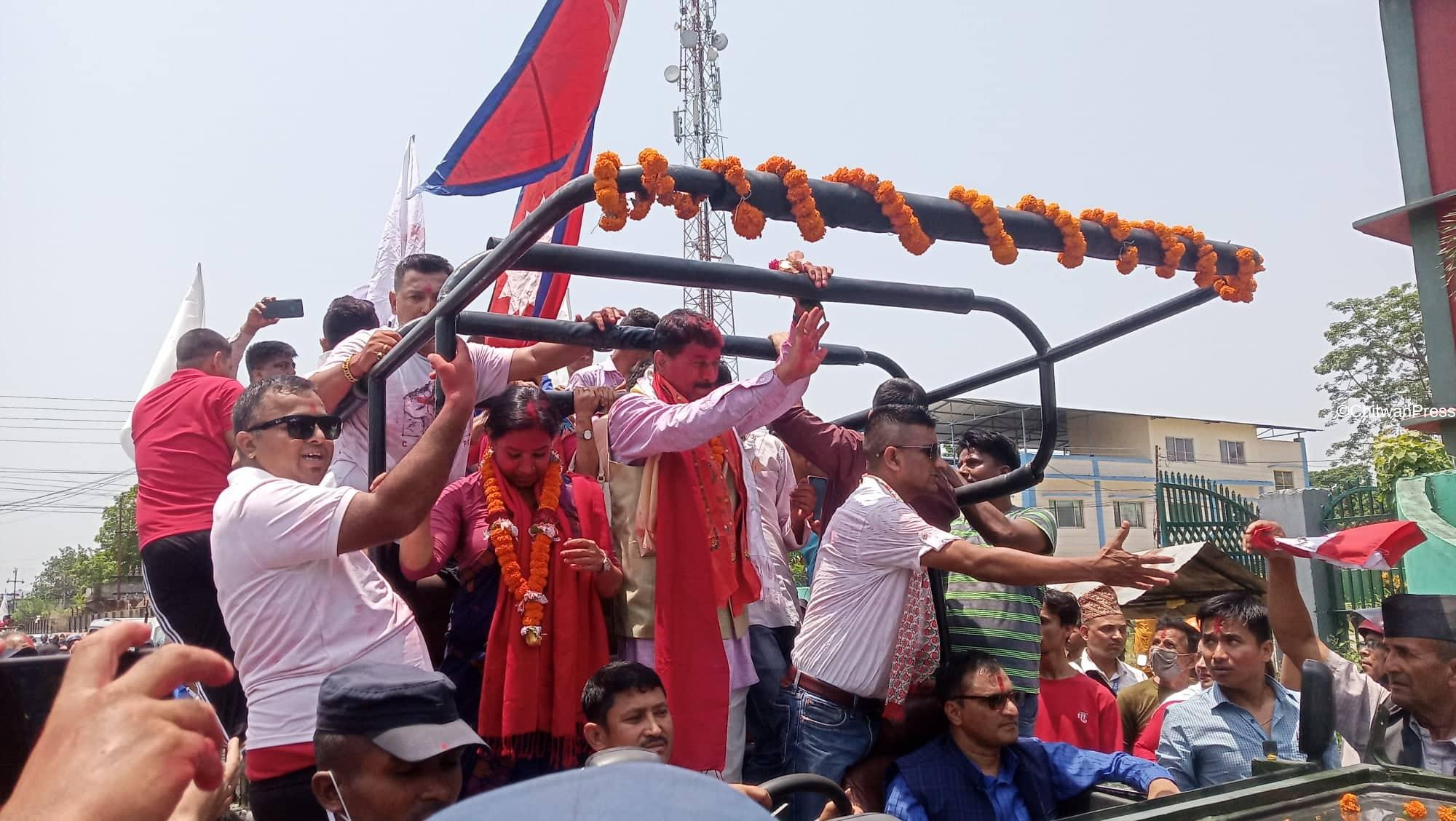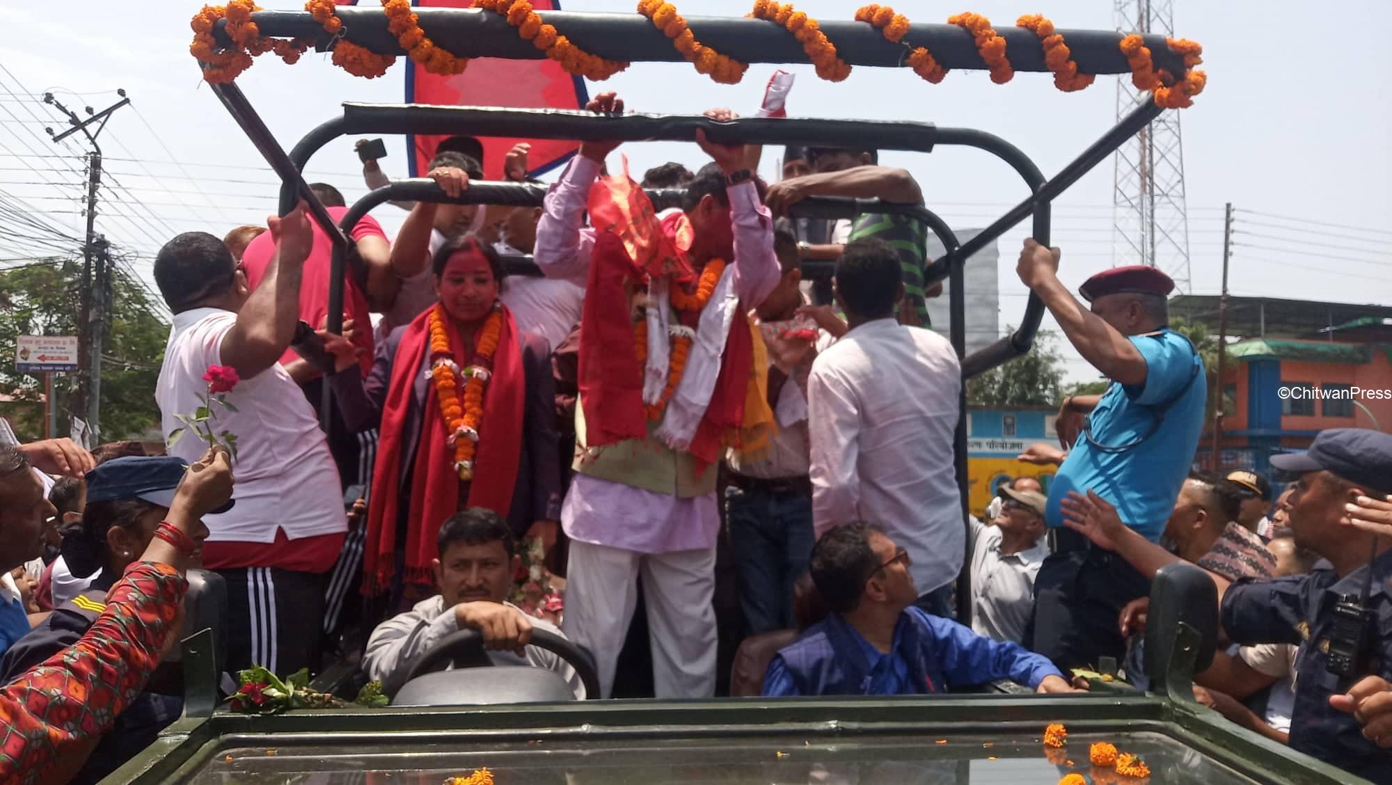 चितवन । चितवनको भरतपुर महानगरपालिकाको मेयर र उपमेयरमा सत्ता गठबन्धनका उम्मेदवार विजयी भएसँगै उत्सव मनाउन सुरु भएको छ । गठबन्धनबाट माओवादी केन्द्रकी उम्मेदवार रेनु दाहाल र उपमेयरमा काँग्रेसका चित्रसेन अधिकारी निर्वाचित भएका हुन् ।