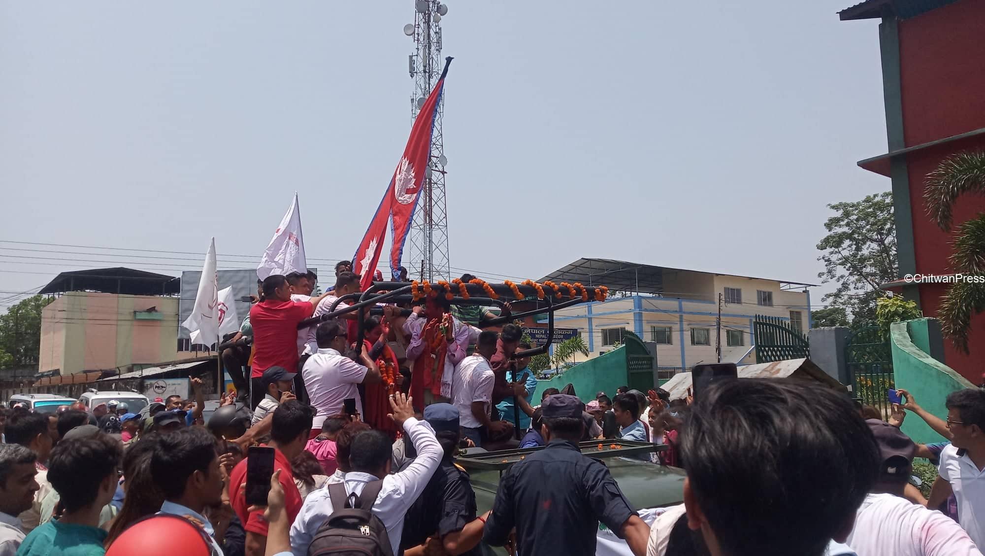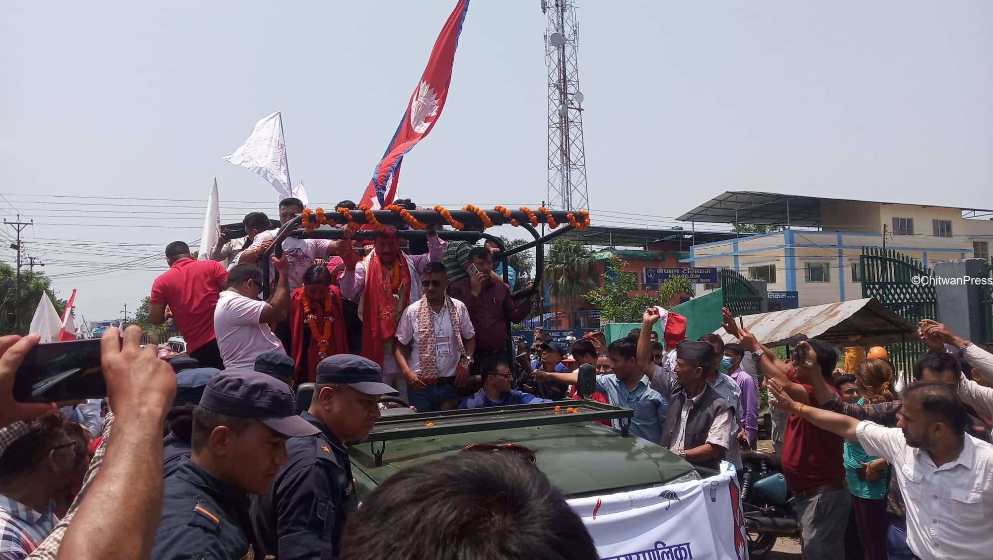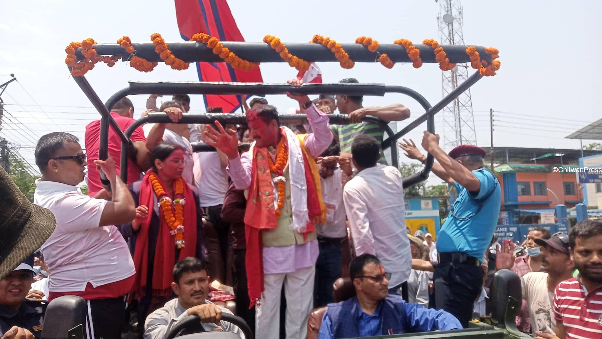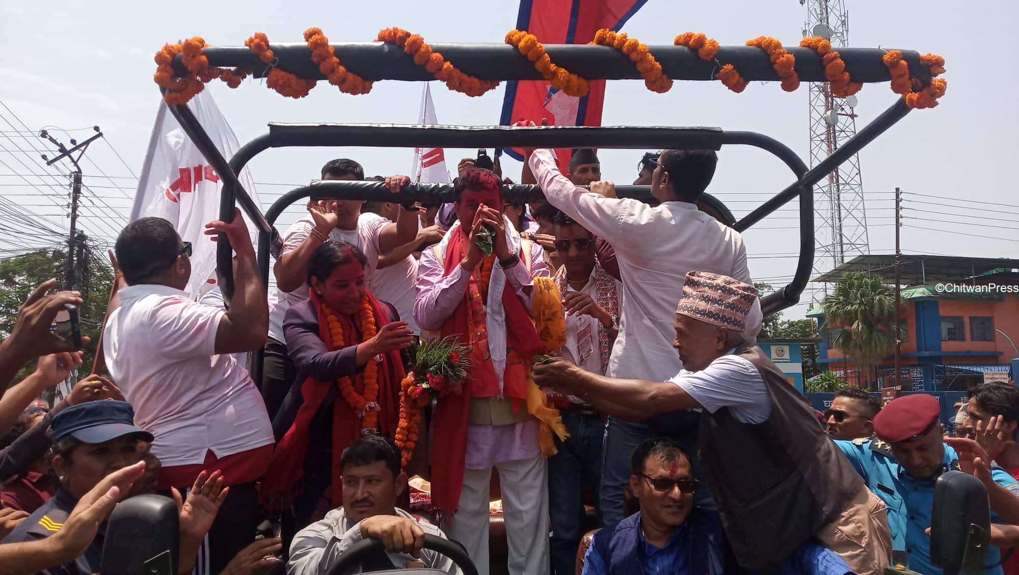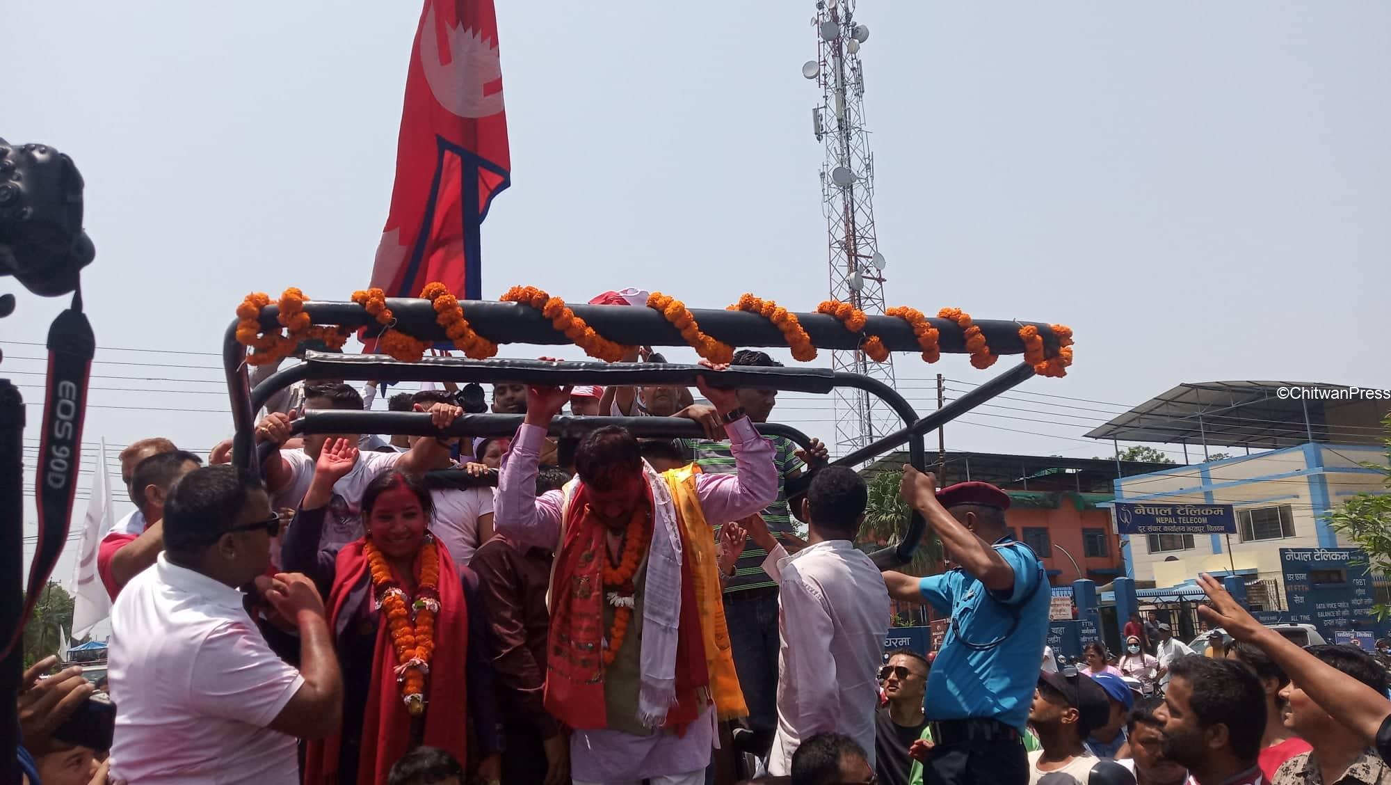 चितवन । चितवनको भरतपुर महानगरपालिकाको मेयर र उपमेयरमा सत्ता गठबन्धनका उम्मेदवार विजयी भएसँगै उत्सव मनाउन सुरु भएको छ । गठबन्धनबाट माओवादी केन्द्रकी उम्मेदवार रेनु दाहाल र उपमेयरमा काँग्रेसका चित्रसेन अधिकारी निर्वाचित भएका हुन् ।