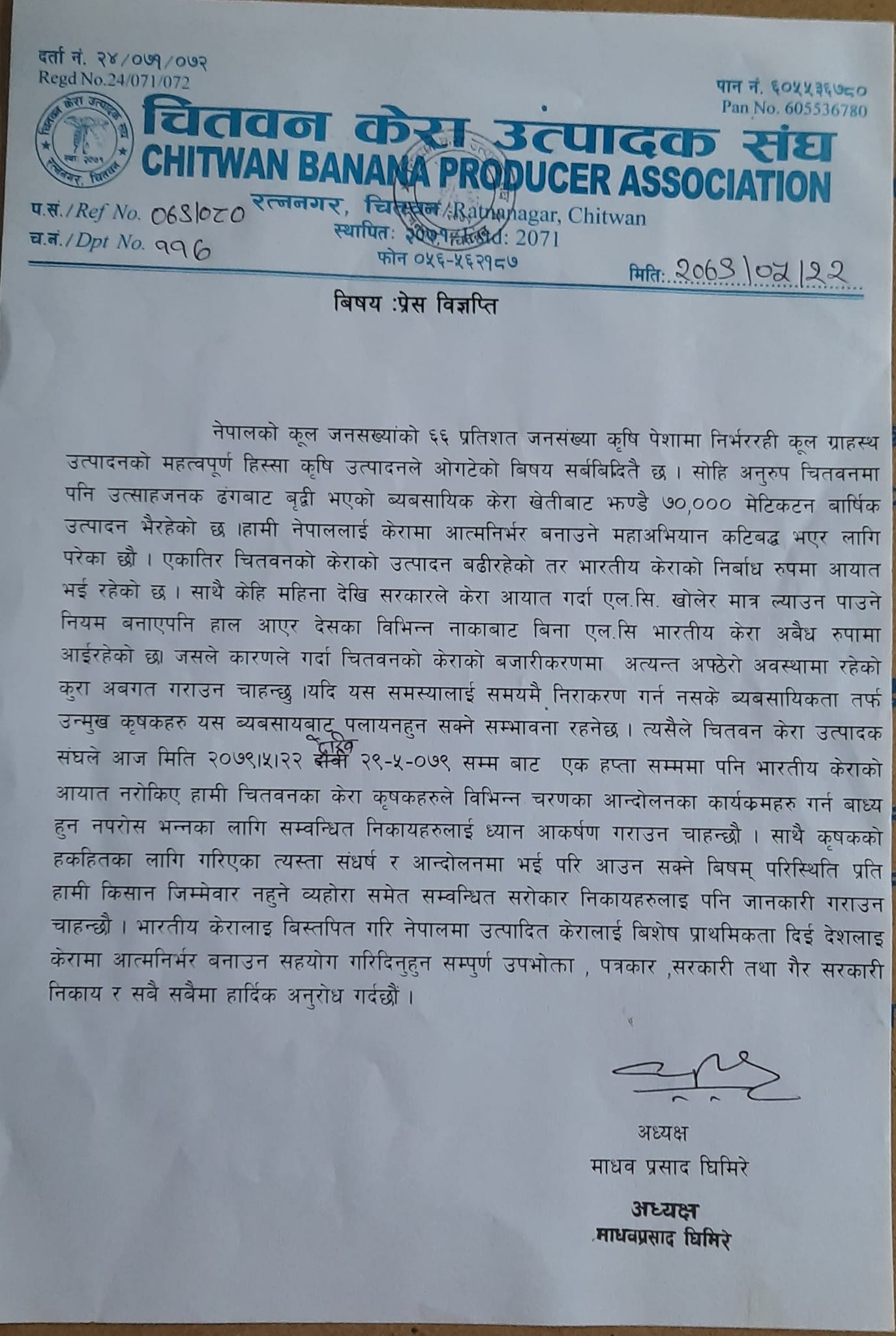 चितवनमा उत्साहजनक ढङ्गबाट वार्षिक ७० हजार मेट्रिकटन केरा उत्पादन भइरहँदा पनि बाहिरबाट आयात भइरहेको र यहाँ उत्पादित केराले बजार नपाएको भन्दै संघले आज ०७९ भदौ २२ गतेदेखी २९ गतेसम्ममा आयात रोक्नुपर्ने संघका अध्यक्ष माधवप्रसाद घिमिरेले बताए ।