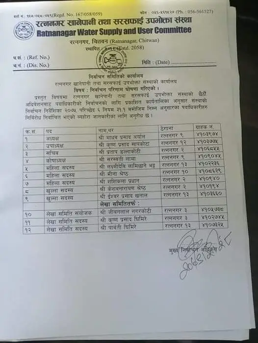 सहमतिको आधारमा खानेपानीको नेतृत्व चयनका लागि कांग्रेसका नगर सभापति समेत रहेका रत्ननगरका मेयर प्रल्हाद सापकोटा संयोजक रहेको कार्यदल बनाइएको थियो । चार प्रमुख दलका नगर नेतृत्वको कार्यदलले पद बाडफाँड गरी खानेपानीको समिति सर्बसम्मत गरेका हुन ।
