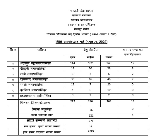 स्वास्थ्य कार्यालय चितवनका अनुसार साउन १ यता अहिले सम्म कुल संक्रमित ३६८ छन् । जसमध्ये २१२ पुरुष र १५६ महिला रहेका छन् । सबैभन्दा बढि भरतपुर महानगरपालिकामा २४६ रहेका छन् ।