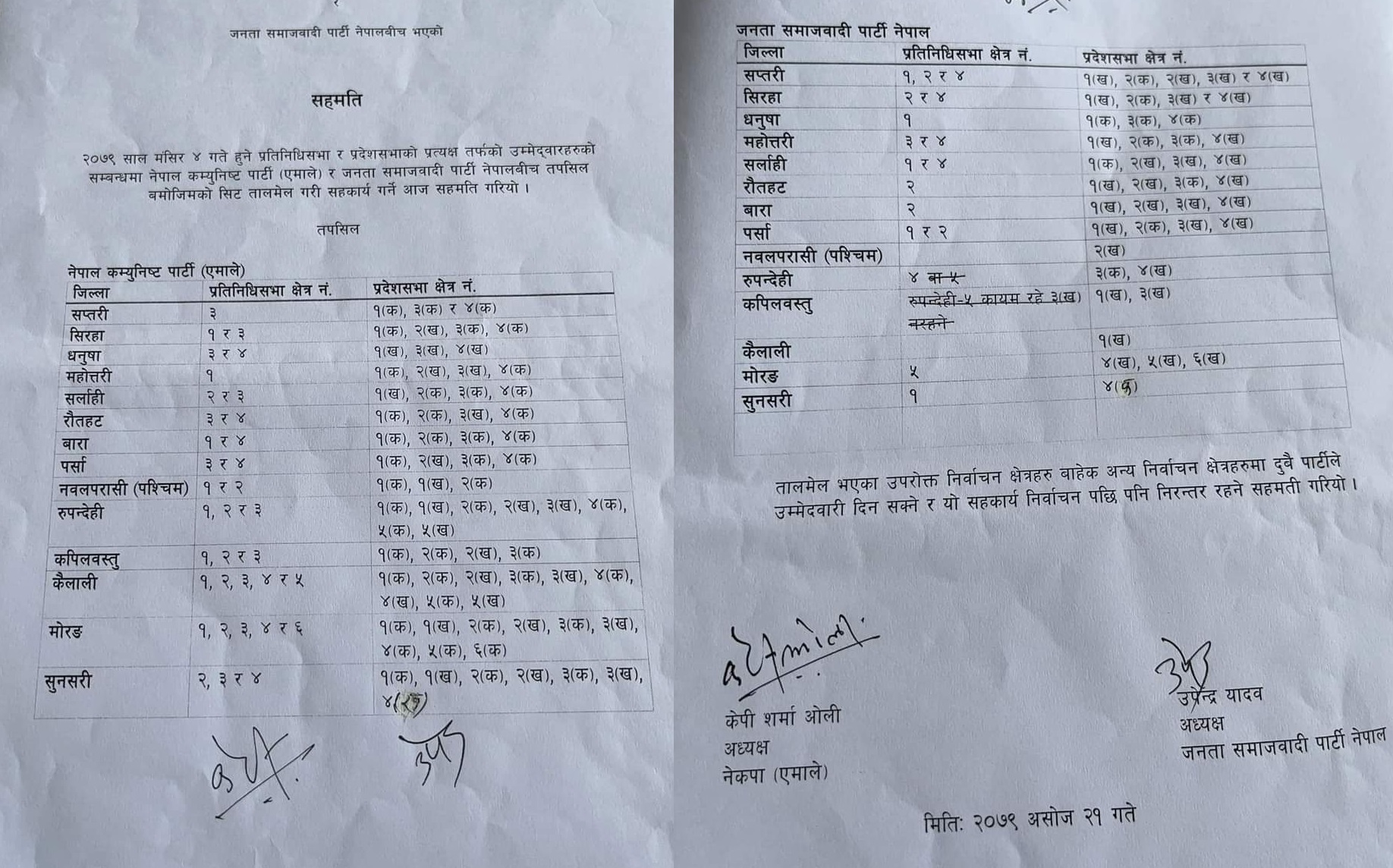 एमाले अध्यक्ष केपी शर्मा ओली र जसपा अध्यक्ष उपेन्द्र यादवले सहमतिपत्रमा हस्ताक्षर गरेका छन् । सहमतिअनुसार जसपाले प्रतिनिधिसभामा १७ सिट र प्रदेशसभातर्फ ४२ सिट पाउने भएको छ।