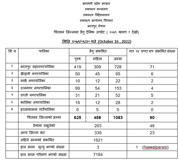 त्यस्तै, हालसम्म तिन जनाको मृत्यु भएको छ । चितवन जिल्लामा हालसम्म ७१८४ जनामा डेंगु परिक्षण गएिको छ ।
