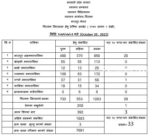 स्वास्थ्य कार्यालय चितवनका अनुसार आज भरतपुर महानगरपालिकामा २८ जना र राप्ती नगरपालिकामा १ जना थपिएका छन् त्यसैगरी ठेगाना नखुलेका १ र अन्य जिल्लाबाट आएका ३ जना छन् ।