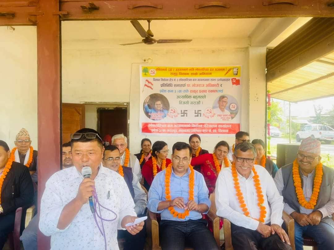 चितवन ।चितवन निर्वाचन क्षेत्र नम्बर ३ प्रतिनिधिसभाका उमेदवार डा. भाेजराज अधिकारीले जनसमर्थन बटुल्न घरदैलोमा जुटेका छन् । हिजो मेघाैली, चनाैली क्षेत्र भुगाेल केन्द्रित जनसंवादमा पुगेका उनी आज शुक्रनगर, शारदानगर, विजयनगरका जनतासँग भेटघाट गरेका छन् । साथै वडा स्तरिय गठबन्धनको संयुुक्त प्रचारप्रसार कार्यालय उद्घाटनमा समेत उनीसँगै प्रदेशका प्रत्यक्ष समानुपातिक उमेदवारहरू सहभागी छन् । एक वडा एक विशेष कार्यक्रमसहित डा. भाेजराज स्थानीयसँगै छलफल पनि गर्ने गरेका छन् ।