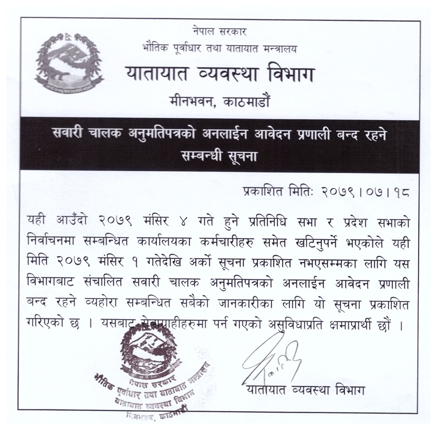 मंसिर ४ गते हुने प्रतिनिधिसभा र प्रदेशसभाको निर्वाचनमा सम्बन्धित कार्यालयका कर्मचारीसमेत खटिनुपर्ने भएकाले अनलाइन आवेदन प्रणाली बन्द गर्नुपरेको यातायात व्यवस्था विभागले शुक्रबार जारी गरेको सूचनामा उल्लेख छ ।