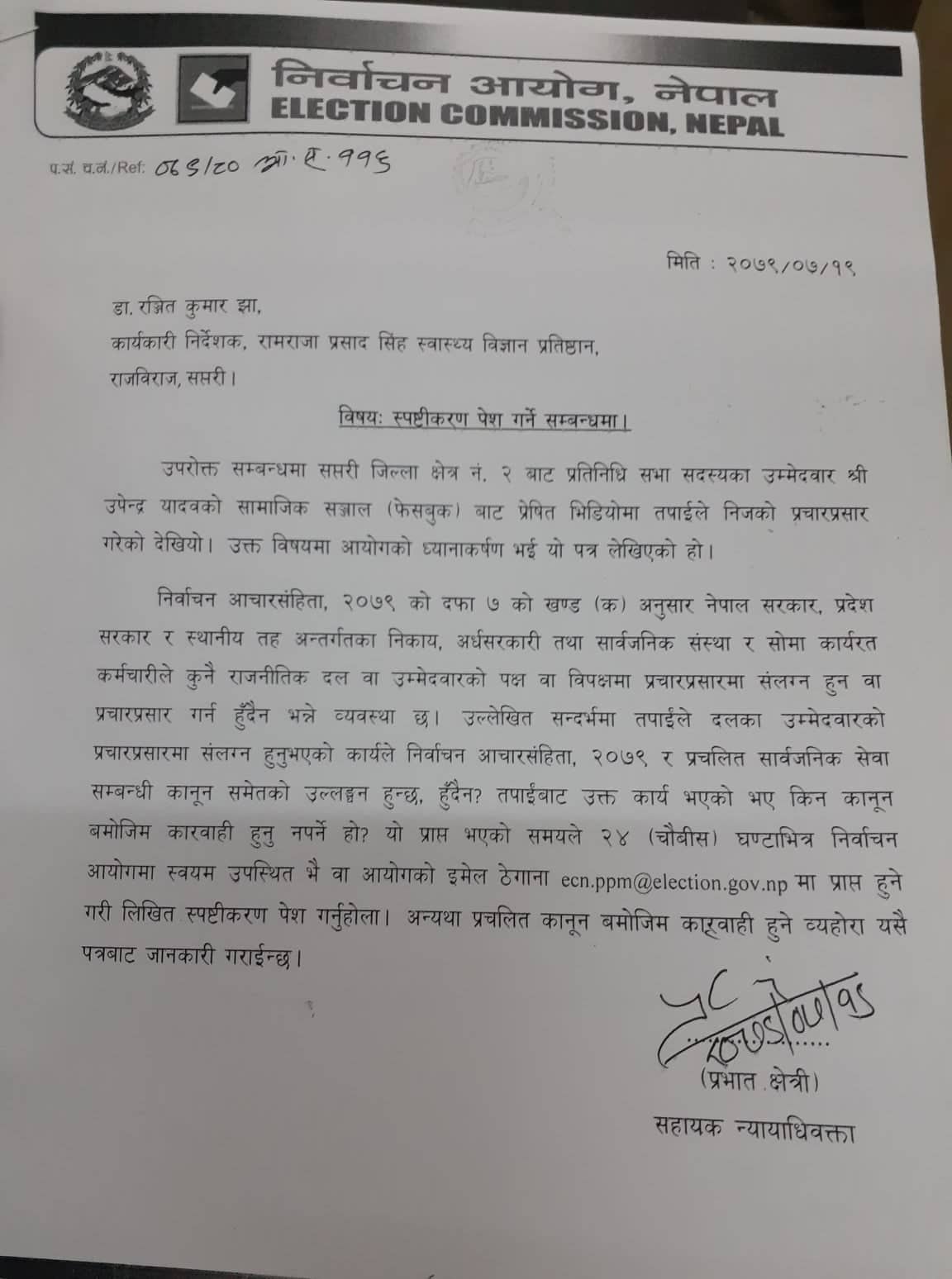 यादवले सेयर गरेको फेसबुक पेजमा डा. झाले गरेको प्रचार प्रसार बारे २४ घण्टाभित्र स्पष्टिकरण दिन आयोगले निर्देशन दिएको छ ।