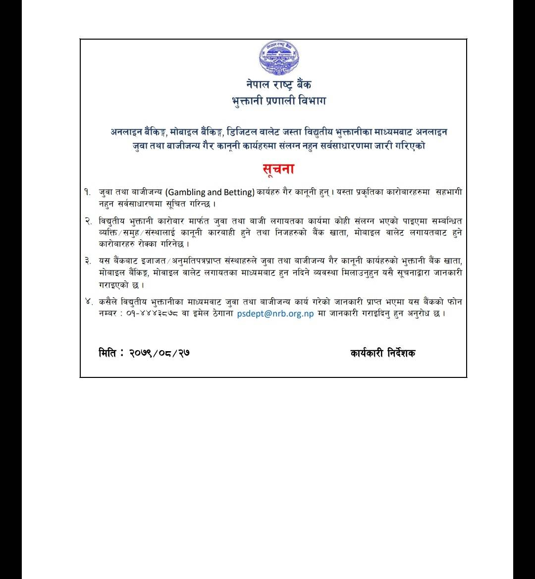 यस बैंकबाट अनुमति प्राप्त बैंक तथा वित्तीय संस्थाहरूले जुवा तथा बाजीजन्य गैर कानुनी कार्यहरुको भुक्तानी बैंक खाता, मोबाइल बैंकिङ, मोबाइल वालेट लगायतका माध्यमबाट हुन नदिन व्यवस्था मिलाउनु पर्नेमा जोड दिएको हो ।