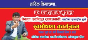काठमाडौं । तत्कालिन नेकपा (एमाले) का नेता घनश्याम भुषाल आज नेकपा (एकीकृत समाजवादी) पार्टीमा प्रवेश गर्दैछन् । पार्टी प्रवेशबारे उनले आज शुक्रबार २ बजे पत्रकार सम्मेलन गरी त्यसबारे जानकारी गराउन लागेका छन् ।