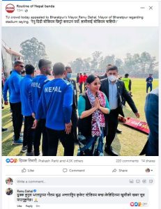 नेपाल र यूएई बीचको खेल हेर्न टियु क्रिकेट मैदान पुगेकी मेयर दाहालले भरतपुरमा निर्माणाधीन रंगशालाको विषयमा केहि दिनमै खुसीको खबर सुन्न पाइने बताएकी छन् । ‘ढुक्क हुनुस्, भरतपुरमा गौतमबुद्ध अन्तर्राष्ट्रिय क्रिकेट स्टेडियम बन्छ । केहिदिनमा खुसीको खबर सुन्न पाउनुहुनेछ’, उनले सामाजिक सञ्जालमा लेखेकी छन् ।