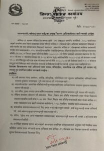 २०७८ बैशाख २१ गतेदेखि सुरु भएर पटक पटक थपिएको निषेधाज्ञा अन्तिमपटक यही ३१ गतेसम्म थपिएको थियो । पछिल्लो समय निषेधाज्ञा खुकुलो बनाएको प्रशासनले अब जिल्लालाई पूर्ववत अवस्थामा फर्काएको जनाएको छ । प्रशासनले स्वास्थ्य मापदण्ड अनिवार्य पालना गर्नुपर्ने जनाएको छ ।