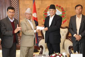 काठमाडौं । नेपाली कांग्रेसका सभापति शेरबहादुर देउवाले प्रधानमन्त्री पुष्पकमल दाहाल प्रचण्डलाई ५० लाख रुपैयाँको चेक बुझाएका छन् ।