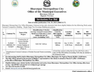 चितवन । भरतपुर महानगरपालिकाले गौतमबुद्ध अन्तर्राष्ट्रिय क्रिकेट रंगशाला निर्माणका लागि टेण्डर आह्वान गरेको छ । महानगरपालिकाले रंगशालाको पहिलो चरणको निर्माण कार्यका लागि १ अर्ब १० करोड रुपैयाँको टेण्डर आह्वान गरेको हो ।