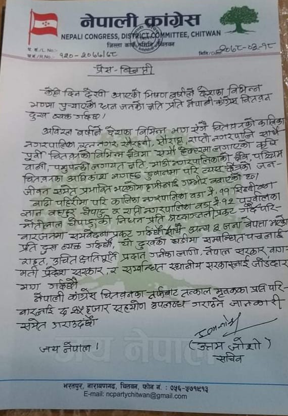 नेपाली कांग्रेस चितवनले पहिरोमा परी मृत्यु भएका