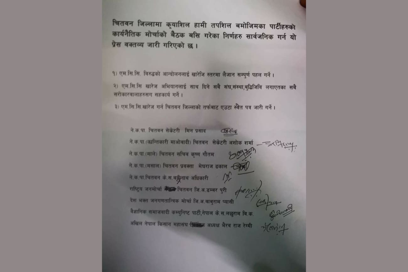 चितवनका राजनीतिक दलद्धारा एमसीसी खारेजका लागि श्वेतपत्र