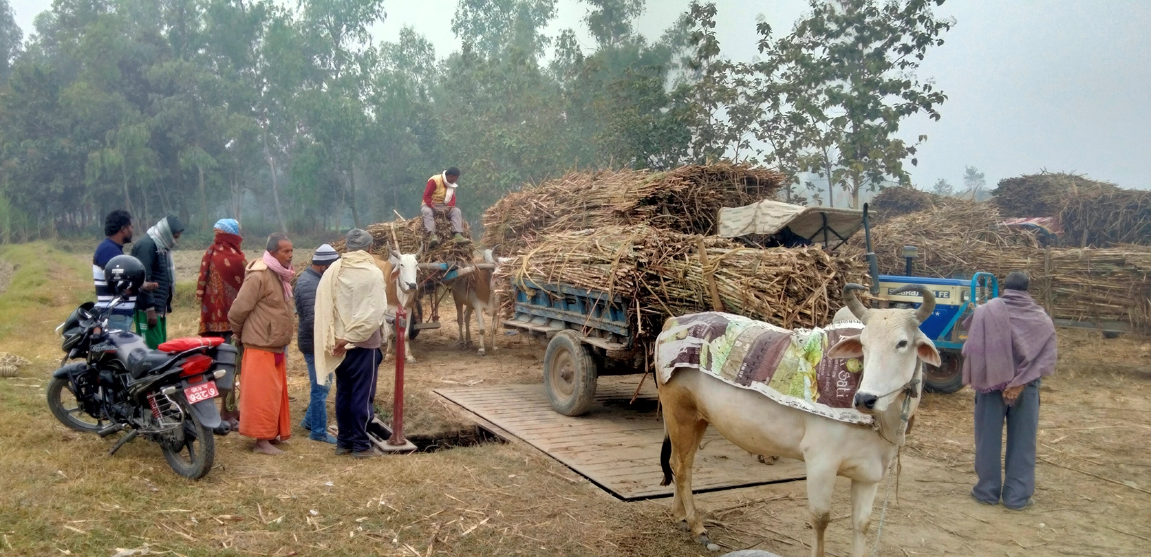 बिक्रीका लागि उखु तौल गर्दै महोत्तरीका किसान