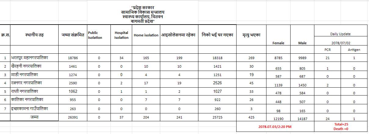 चितवनमा २५ संक्रमित थपिए, अब सक्रिय संक्रमित