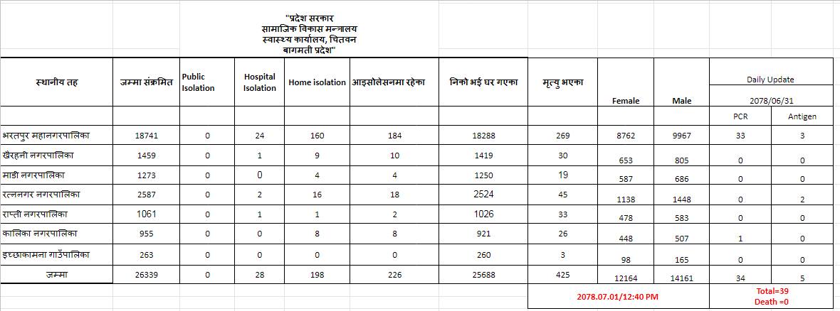 चितवनमा आज ३९ कोरोना संक्रमित थपिए