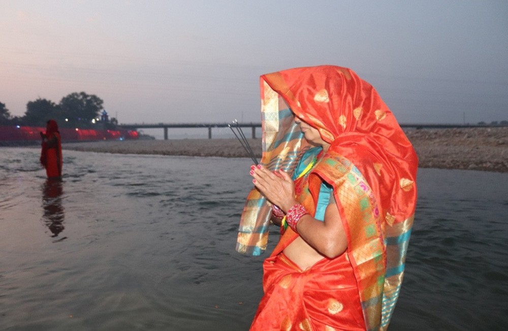 नारायणी नदी किनारमा उदाउँदो सूर्यलाई अर्घ दिएर