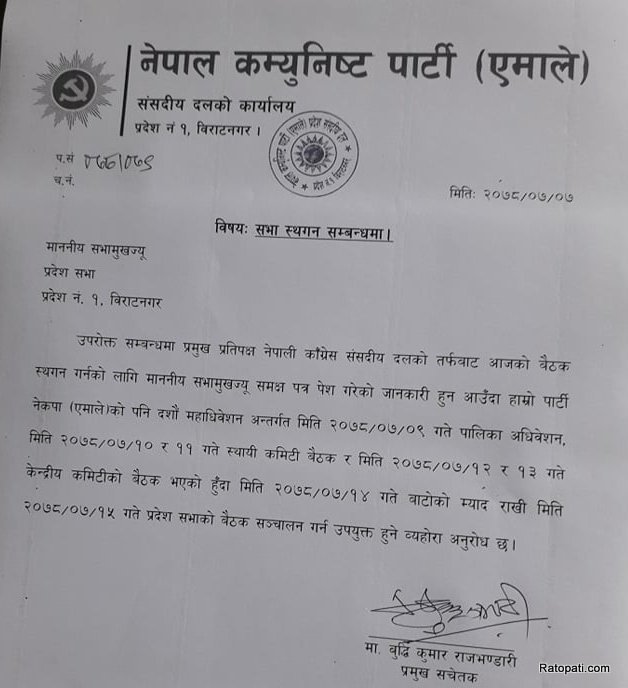 प्रदेशसभा बैठक स्थगित गर्न एमालेको माग