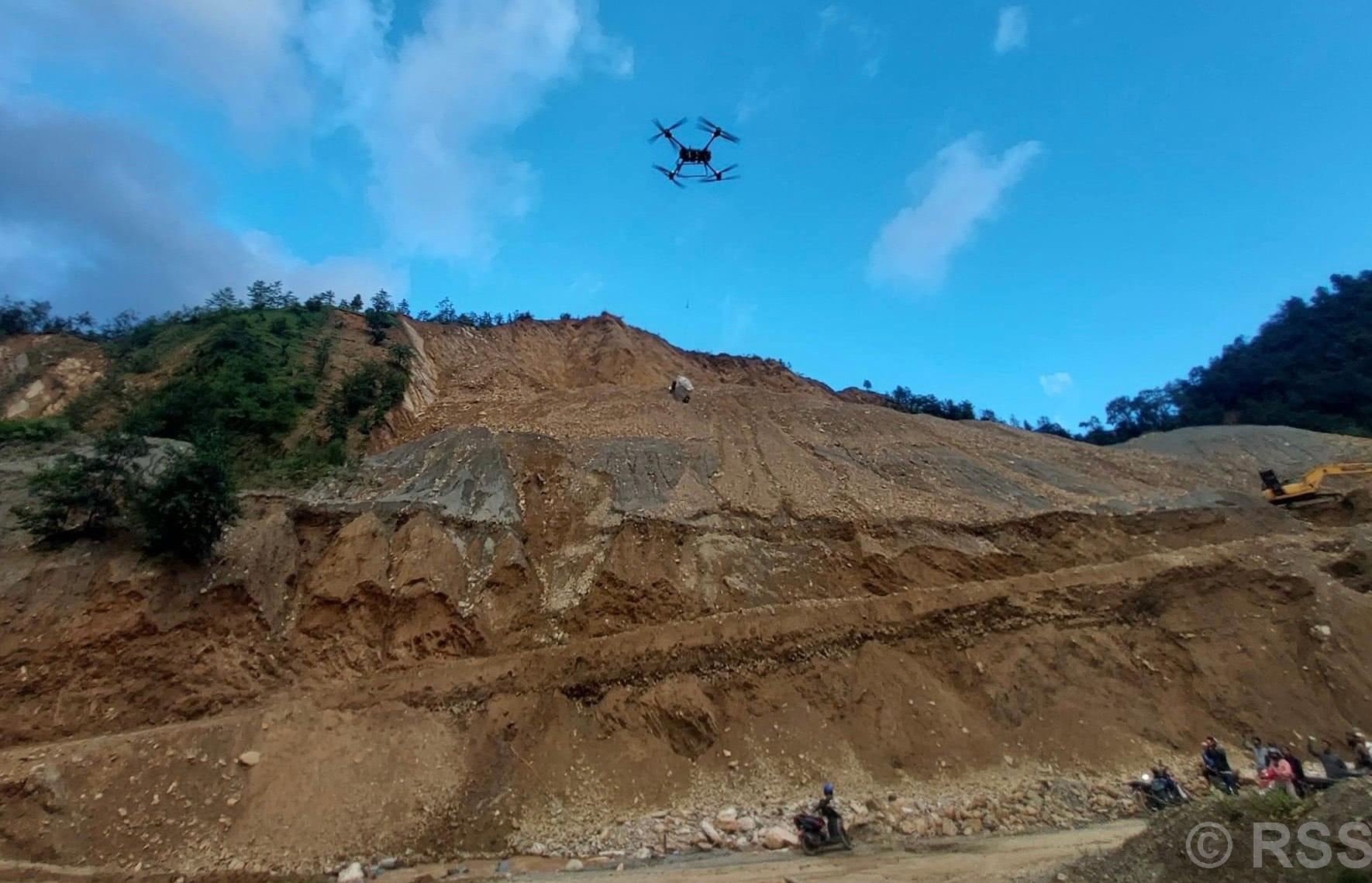 बाढीपहिरो : काभ्रेमा सडक अवरुद्ध बस्तीमा ड्रोनमार्फत