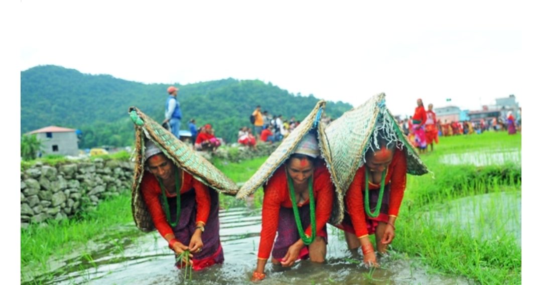 भक्तपुरमा धान रोपाइँ गर्दै किसानहरु