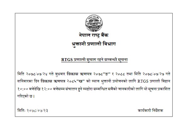 राष्ट्र बैंकको आरटीजीएस प्रणाली बुधबार र शनिबार